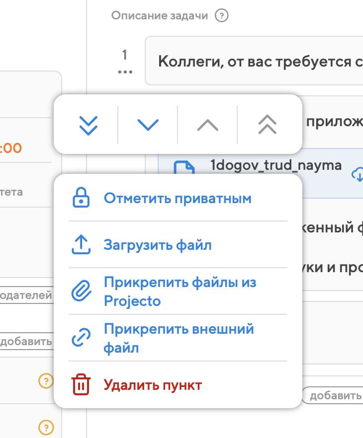 У каждого пункта в описании есть кнопка меню в виде многоточия. В этом меню можно управлять порядком пунктов в описании, настраивать приватность, добавлять вложения или удалять пункты. Приватные пункты видны только автору задачи и не участвуют в общей нумерации. Вложения (фото и видео) можно добавлять к текстовым пунктам и к чеклистам.