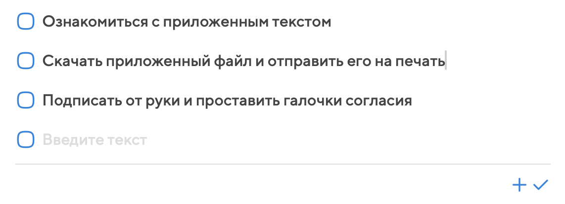 При редактировании чеклистов появляются дополнительные элементы интерфейса: плюс для добавления новой строки (вместо него можно пользоваться клавишей Enter) и галочка для завершения работы с чеклистом в целом.