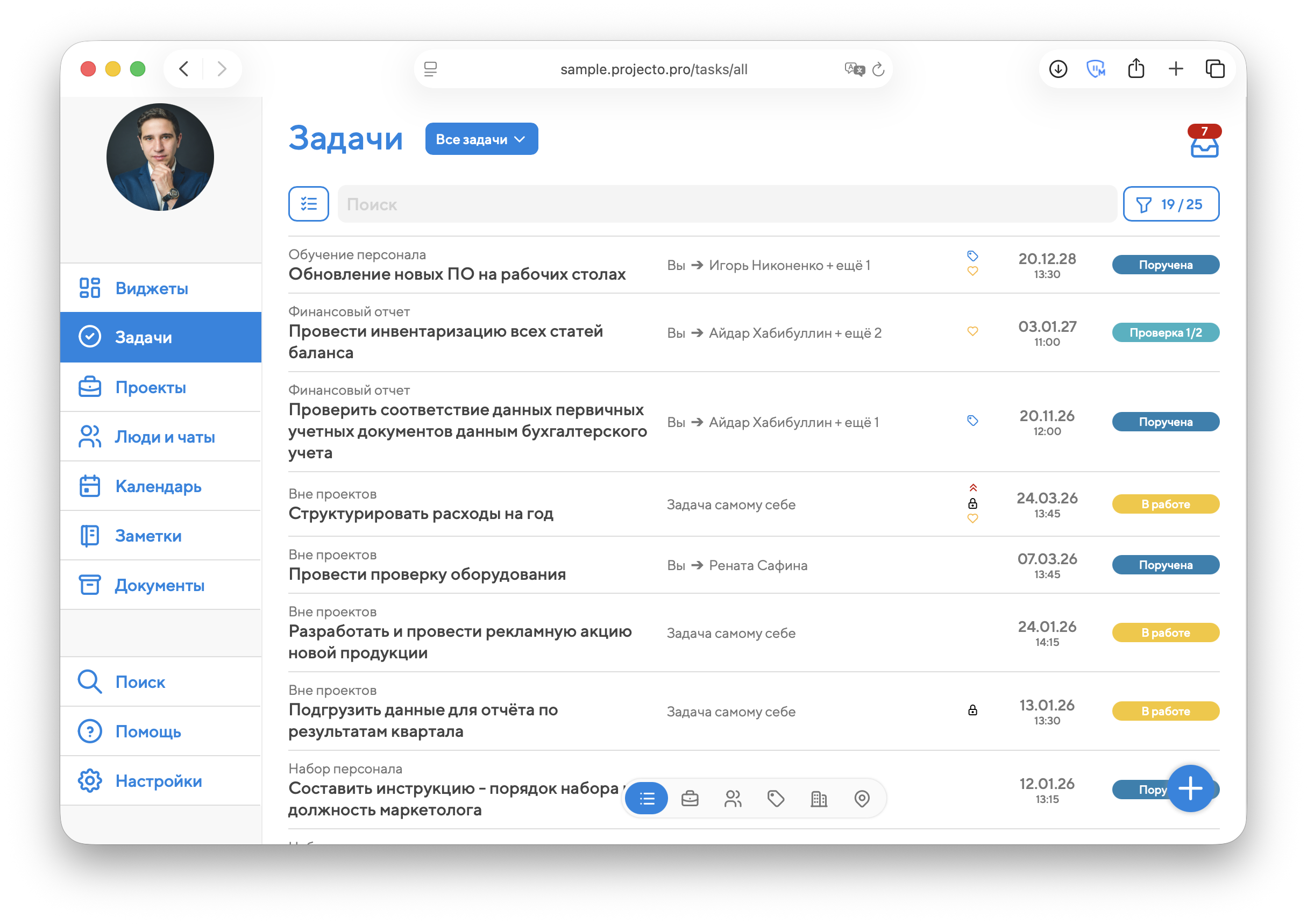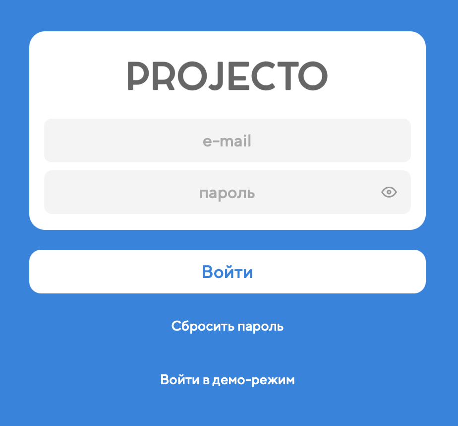 Для всех этих целей предназначен демо-режим Projecto. Он существует как в веб-версии, так и в мобильных приложениях. Чтобы перейти в демо-режим, нажмите на кнопку "Войти в демо-режим" на экране входа в Projecto: