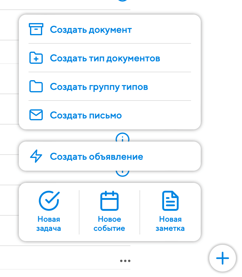 Право на создание документов есть у всех пользователей Projecto. Для создания документов используется универсальный плюс в правом нижнем углу: