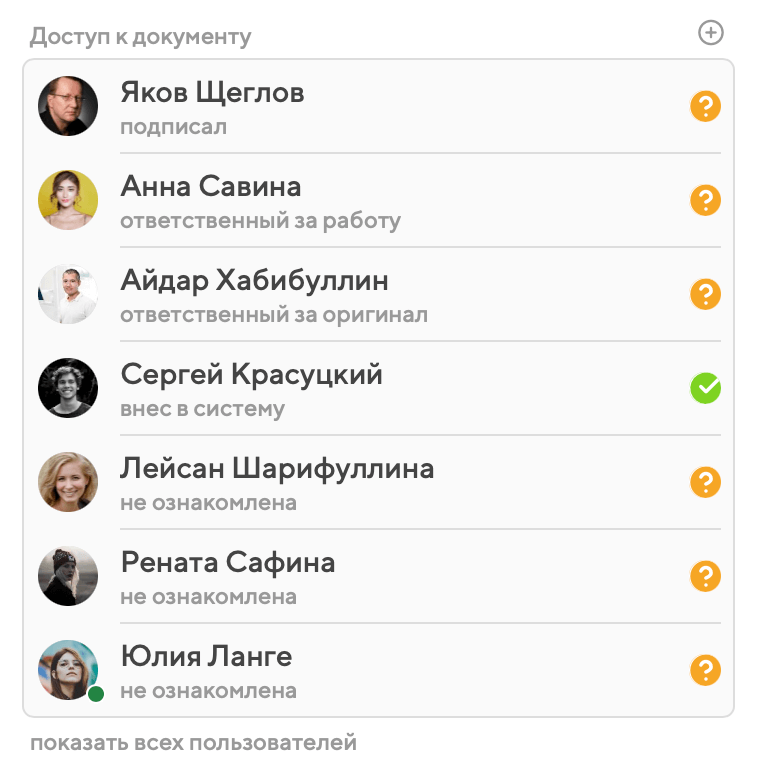 Правильный выбор типа очень важен – он напрямую влияет на то, удобно ли будет найти этот документ спустя какое-то время. Если у вас есть сомнения в том, к какому типу отнести ваш документ, если нужного типа нет или в него нужно добавить какие-либо новые обязательные поля, обратитесь к тем, кто имеет права доступа к документообороту. Посмотреть таких сотрудников можно в разделе "Люди", справа от них в секции "Права" будет написано "Документооборот".