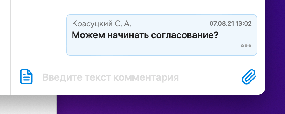 Лента активности – универсальный чат по документу, который объединяет комментарии, записи истории (например, о смене статуса, добавлении участников и пр.) и вложения (файлы и заметки). Он устроен аналогично задачам, событиям и проектам: