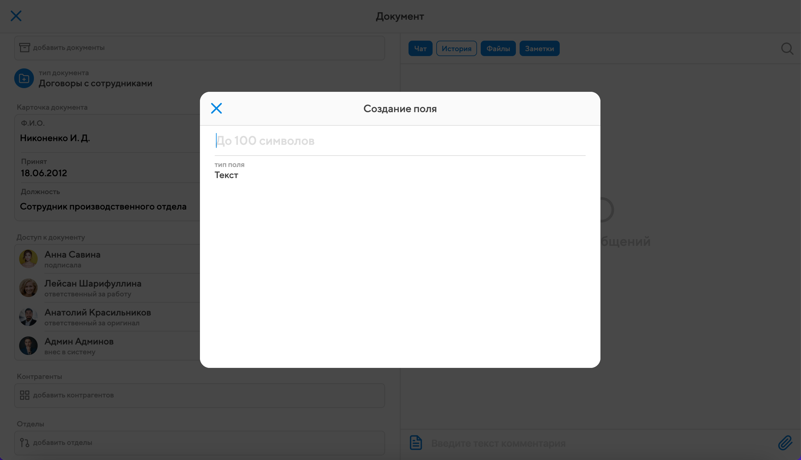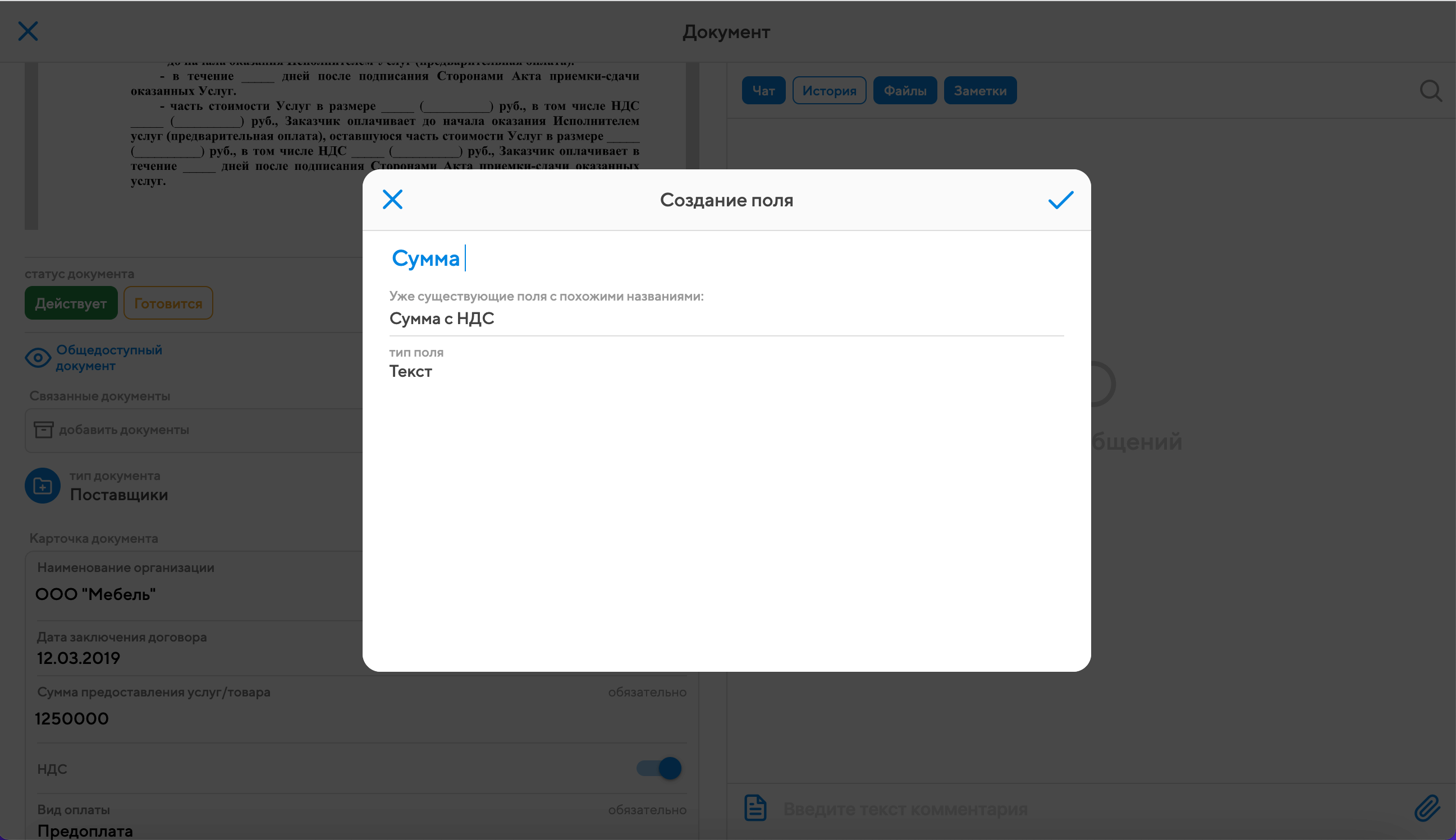 После нажатия на плюс вам нужно будет выбрать тип поля и указать название, отличное от названий уже существующих полей - после чего оно появится в карточке документа. Дополнительные поля действуют только на редактируемый документ и никак не затрагивают сам тип документа.