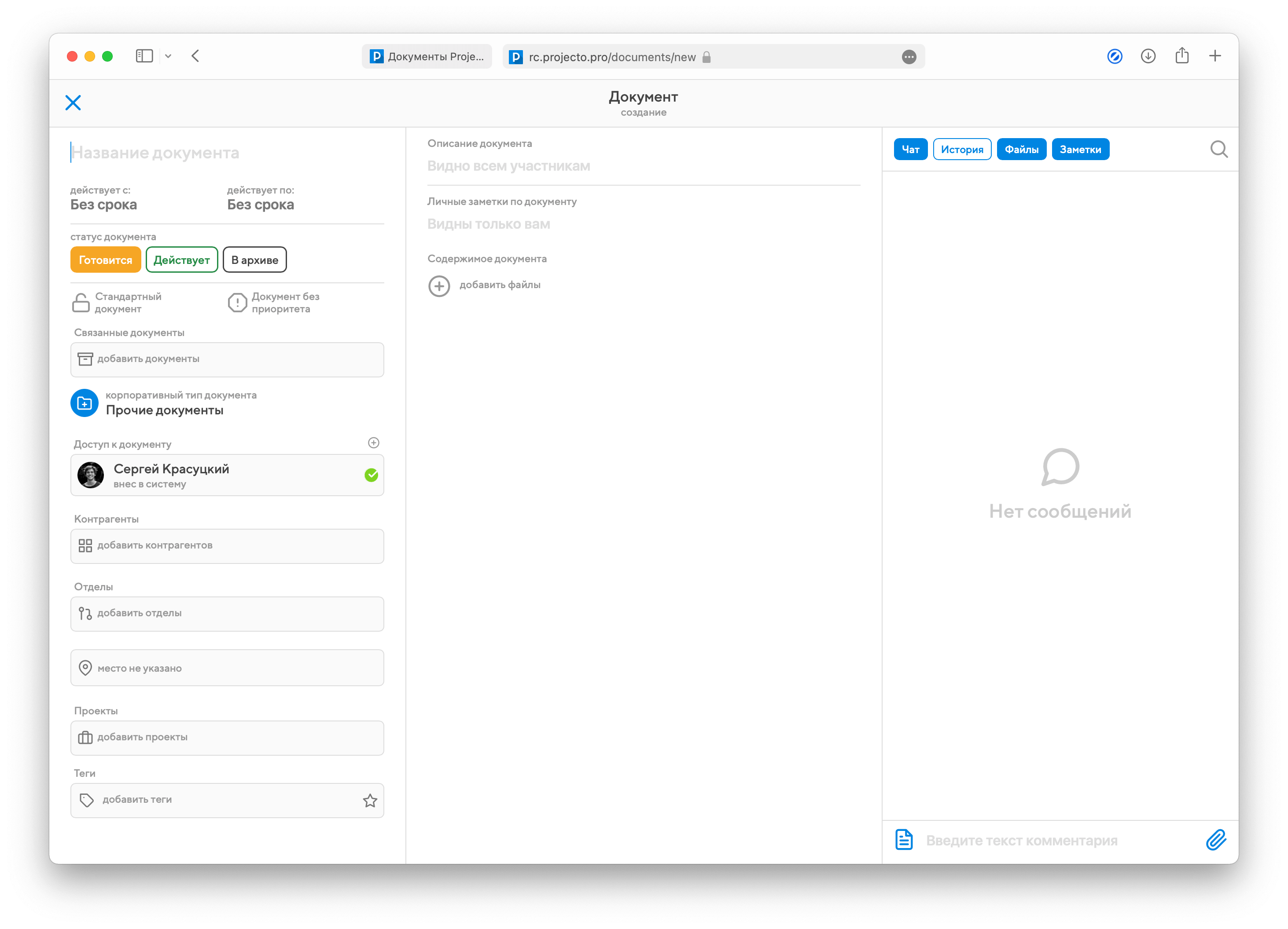 Откроется окно создания документа. Оно во многом похоже на окна задач и событий. Слева настраиваются основные атрибуты и список участников, в центре – описание, содержимое, справа расположен чат для обсуждения документа.