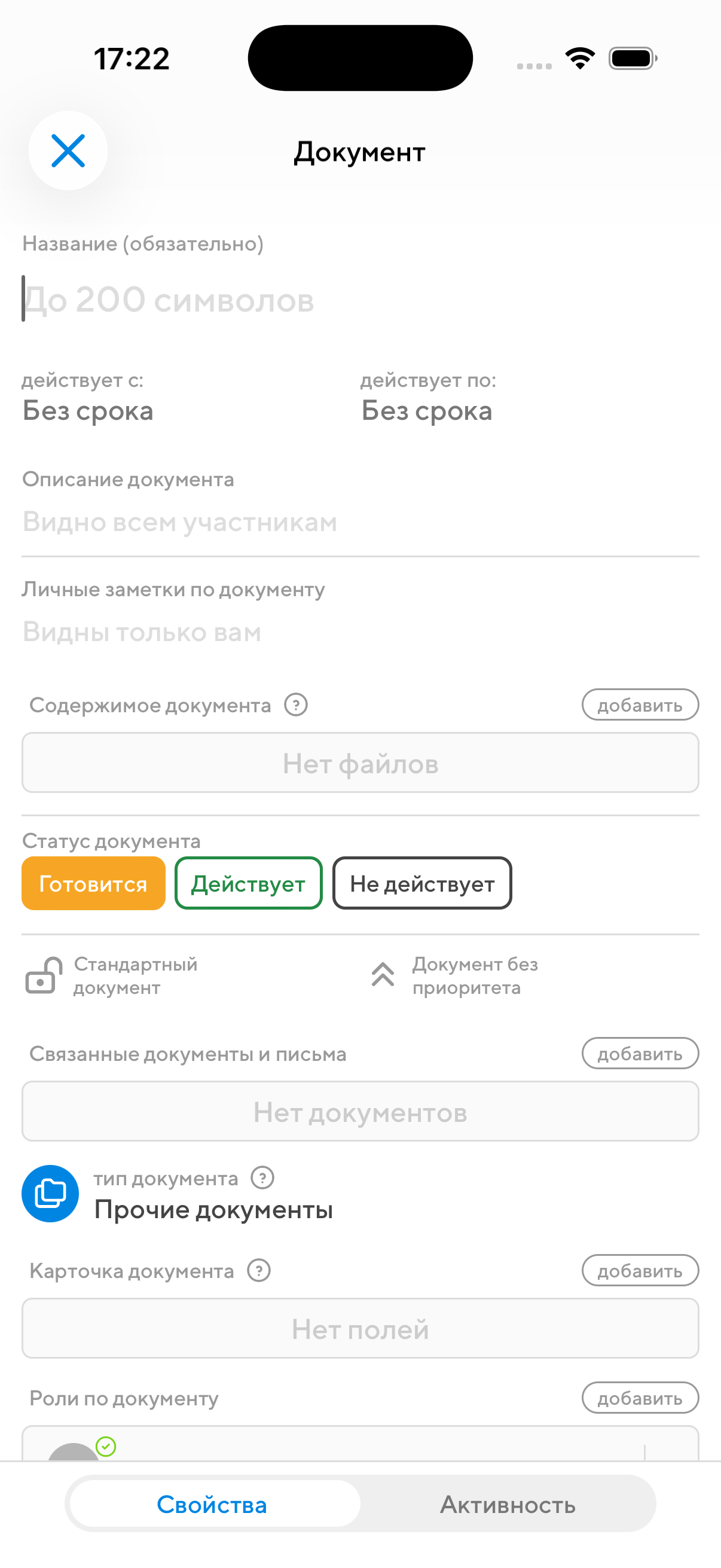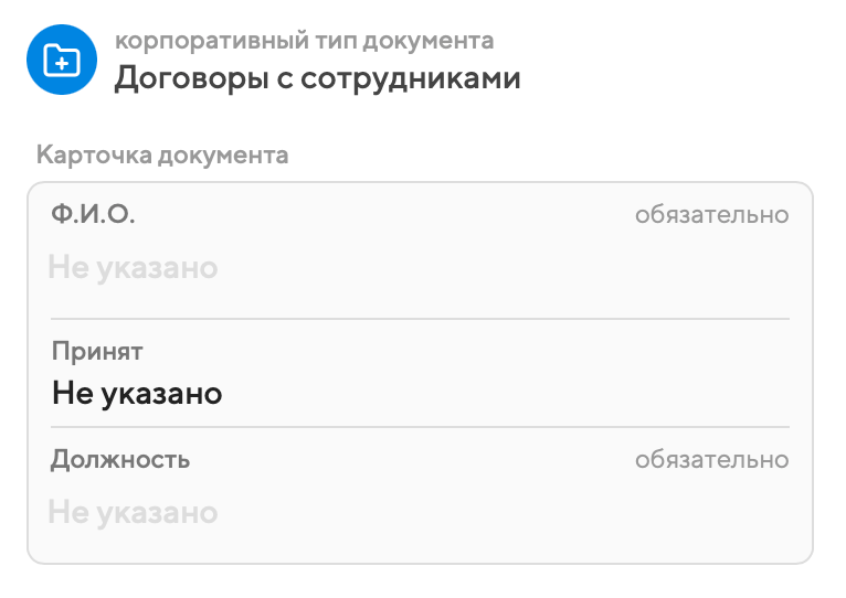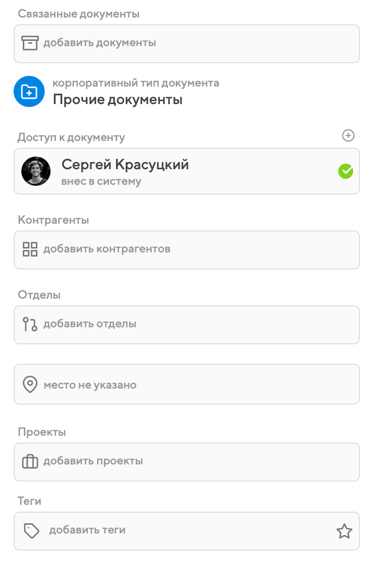 Главный блок в информации о документе – его карточка. По умолчанию новые документы попадают в тип "Прочие документы", карточка которого пуста. Но если вы меняете тип на любой другой, то ниже появятся поля карточки, связанные с этим типом: