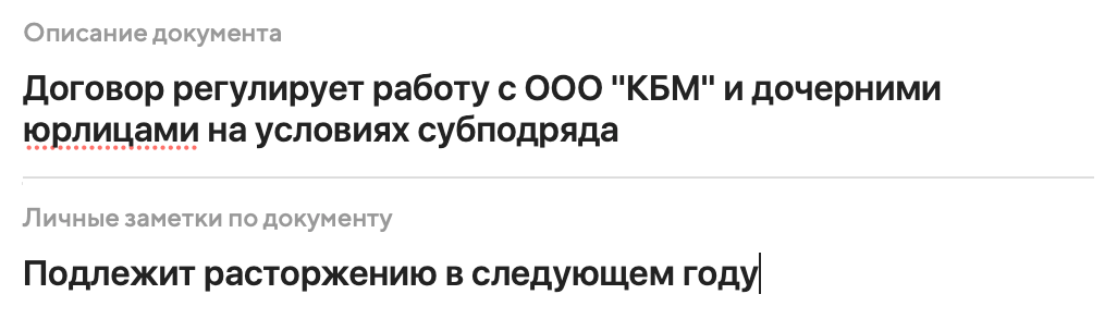 Личные заметки по документу – дополнительное текстовое поле, в котором можно записать личные комментарии по документу, которые не будут видны никому, кроме вас. Например, это поле может пригодиться во время подготовки договора.