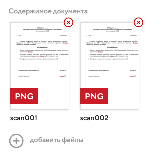 Блок с содержимым документа может состоять из любого количества файлов любых поддерживаемых форматов. Файлы, входящие в содержимое, показываются в виде миниатюр.