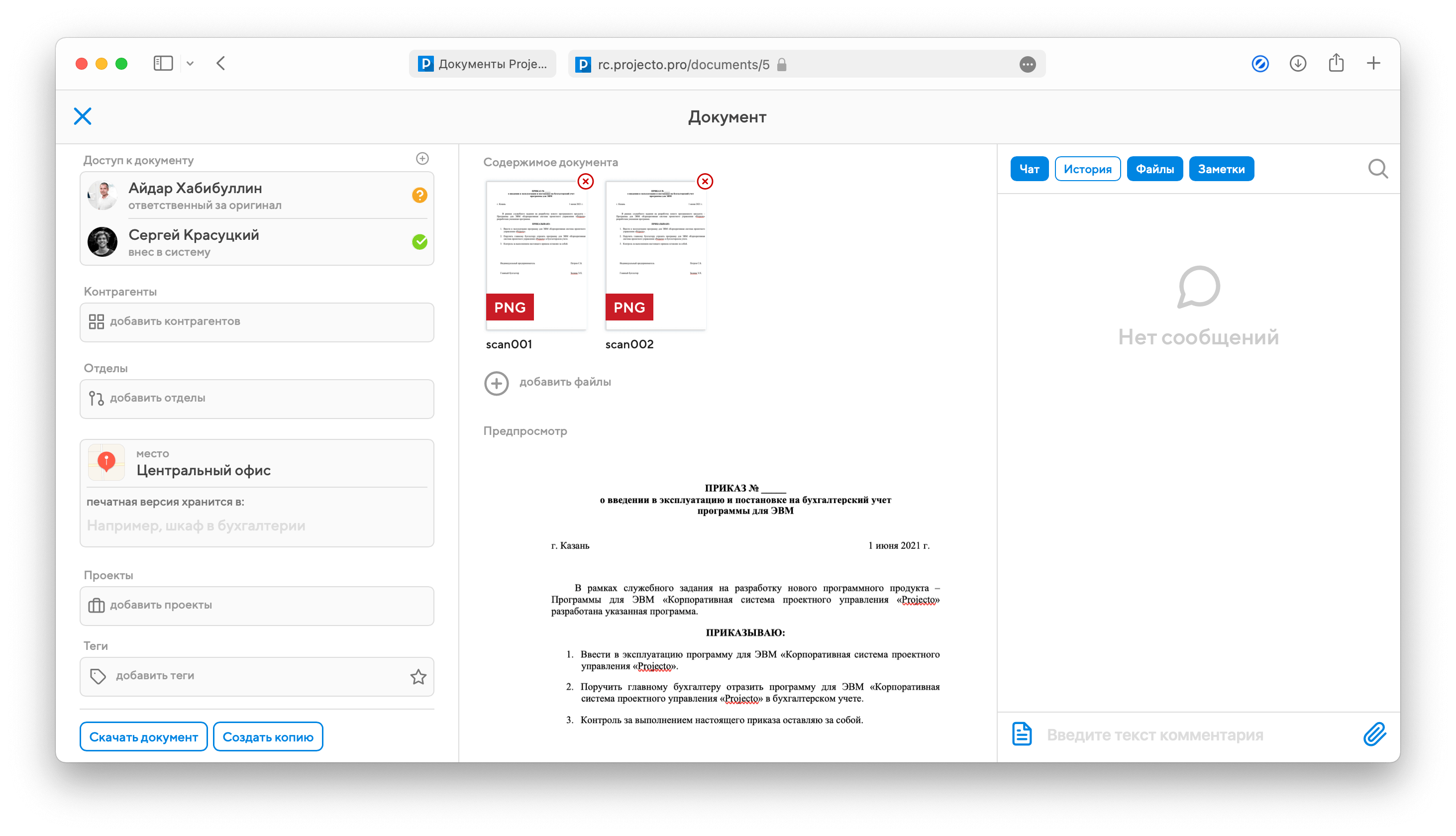 Обратите внимание, что вложения в чате по документу и содержимое этого документа – разные вещи. Например, в ходе подготовки договора разные специалисты могут скидывать фрагменты текста в чат, а затем автор документа скомпонует из них итоговое содержимое.