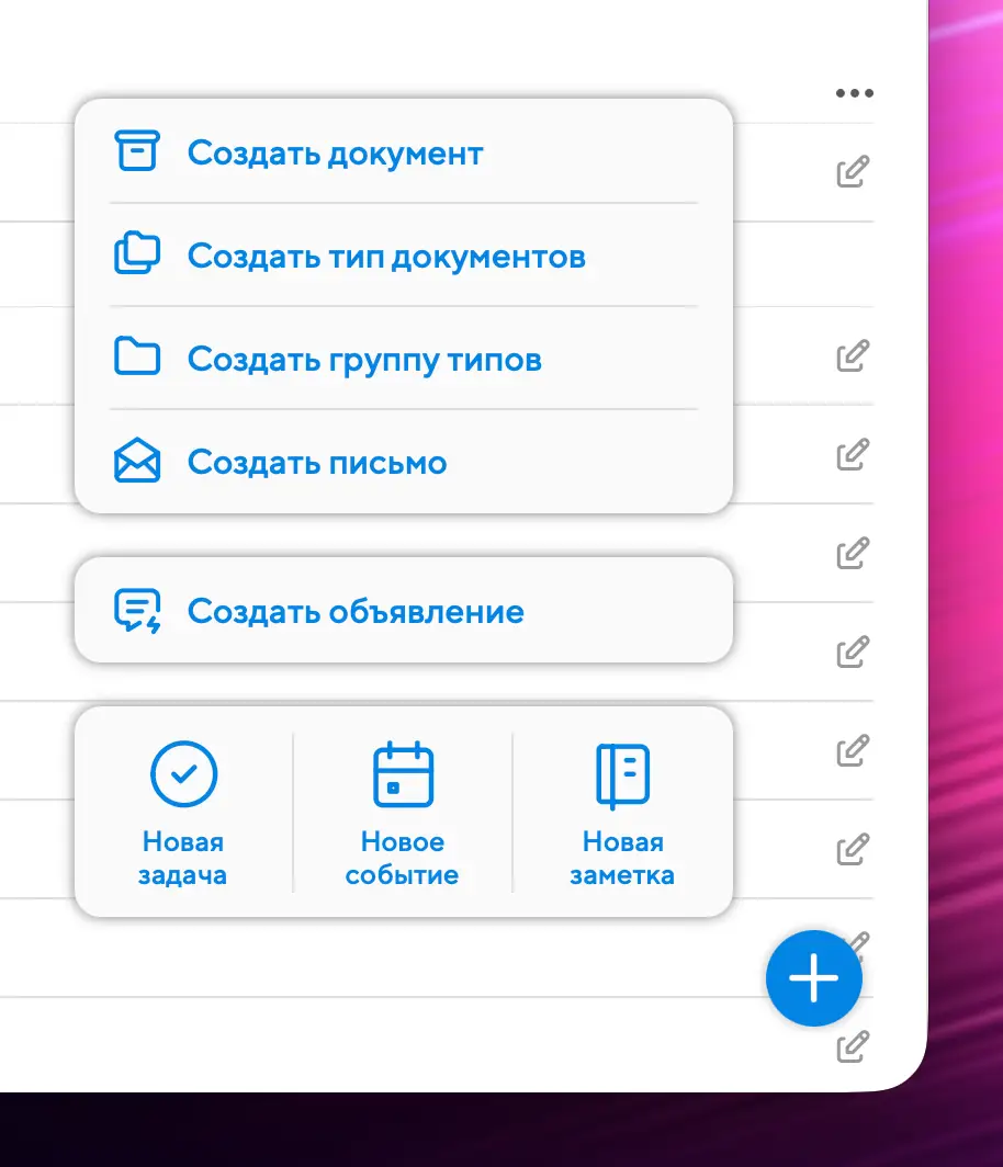 Право на создание документов есть у всех пользователей Projecto. Для создания документов используется универсальный плюс в правом нижнем углу: