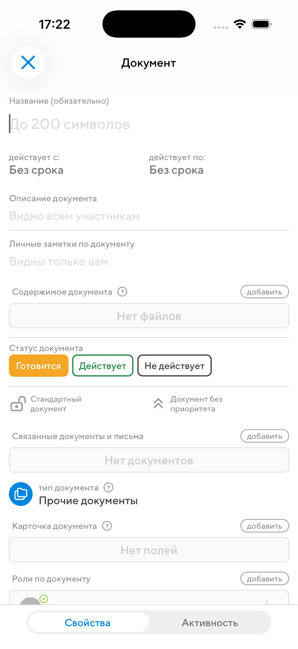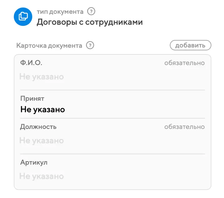 Главный блок в информации о документе – его карточка. По умолчанию новые документы попадают в тип "Прочие документы", карточка которого пуста. Но если вы меняете тип на любой другой, то ниже появятся поля карточки, связанные с этим типом: