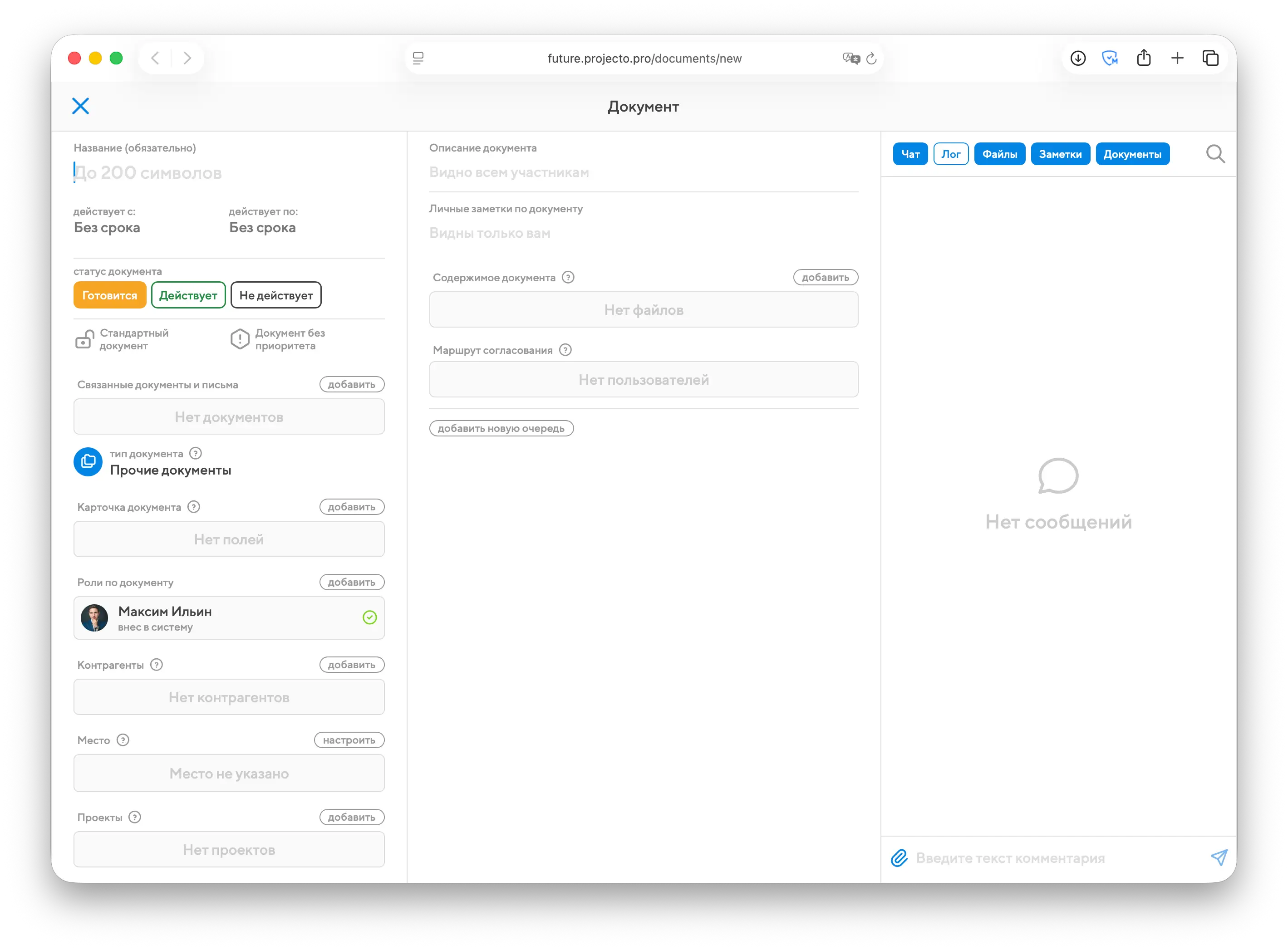 Откроется окно создания документа. Оно во многом похоже на окна задач и событий. Слева настраиваются основные атрибуты и список участников, в центре – описание, содержимое, справа расположен чат для обсуждения документа.