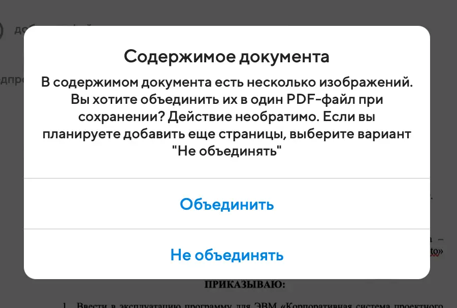 В настройках Projecto в разделе "Настройки документов" есть опция "Объединять содержимое документов и писем в PDF". Если она включена, то при сохранении документа с несколькими изображениями в содержимом вам предложат объединить эти изображения в один PDF-файл. Это полезно, когда сканируется многостраничный документ, и хочется автоматически объединить все сканы: