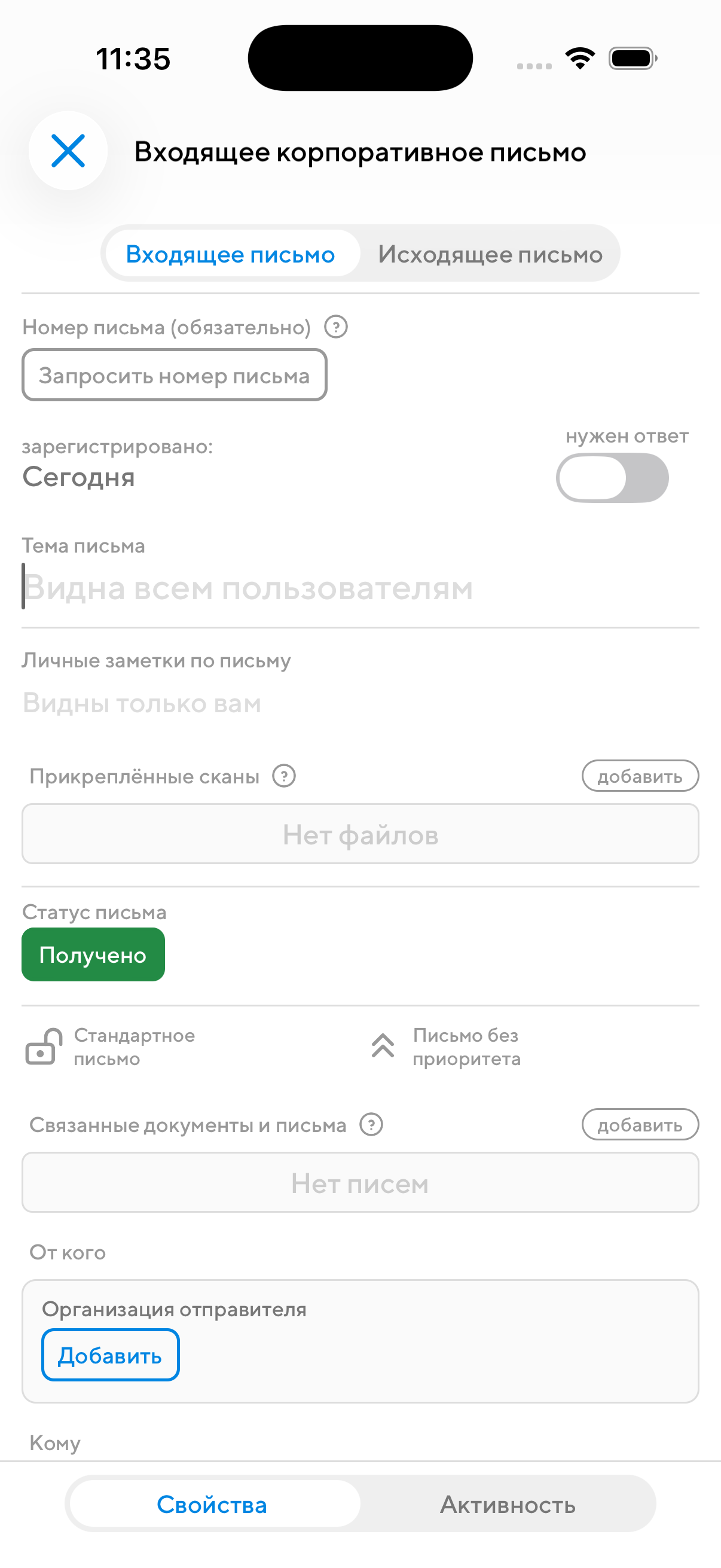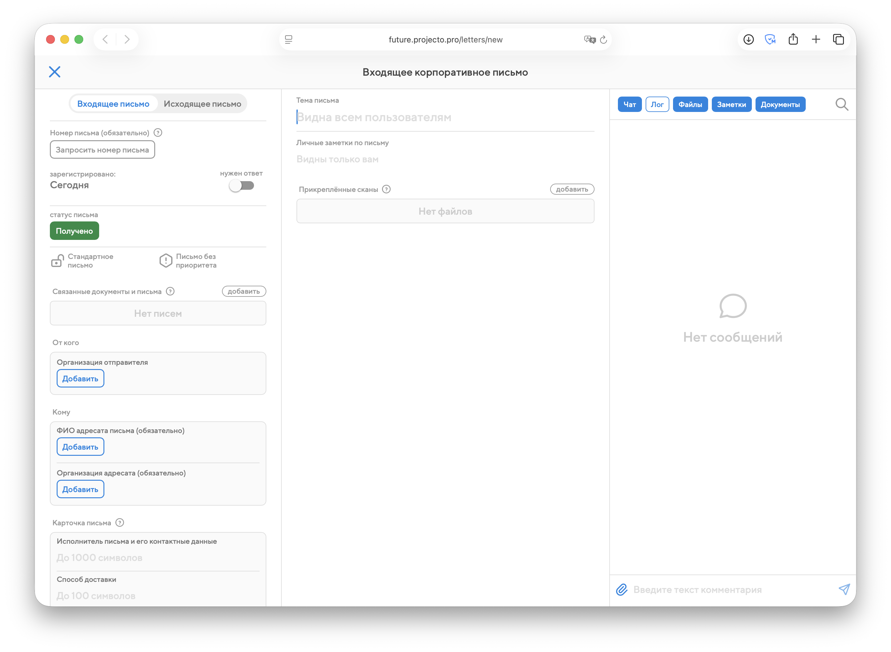 Откроется окно создания письма. Оно очень похоже на окно документа, разница лишь в том, что для писем возможны только два типа: входящие или исходящие, и карточки для этих типов предустановлены в Projecto.