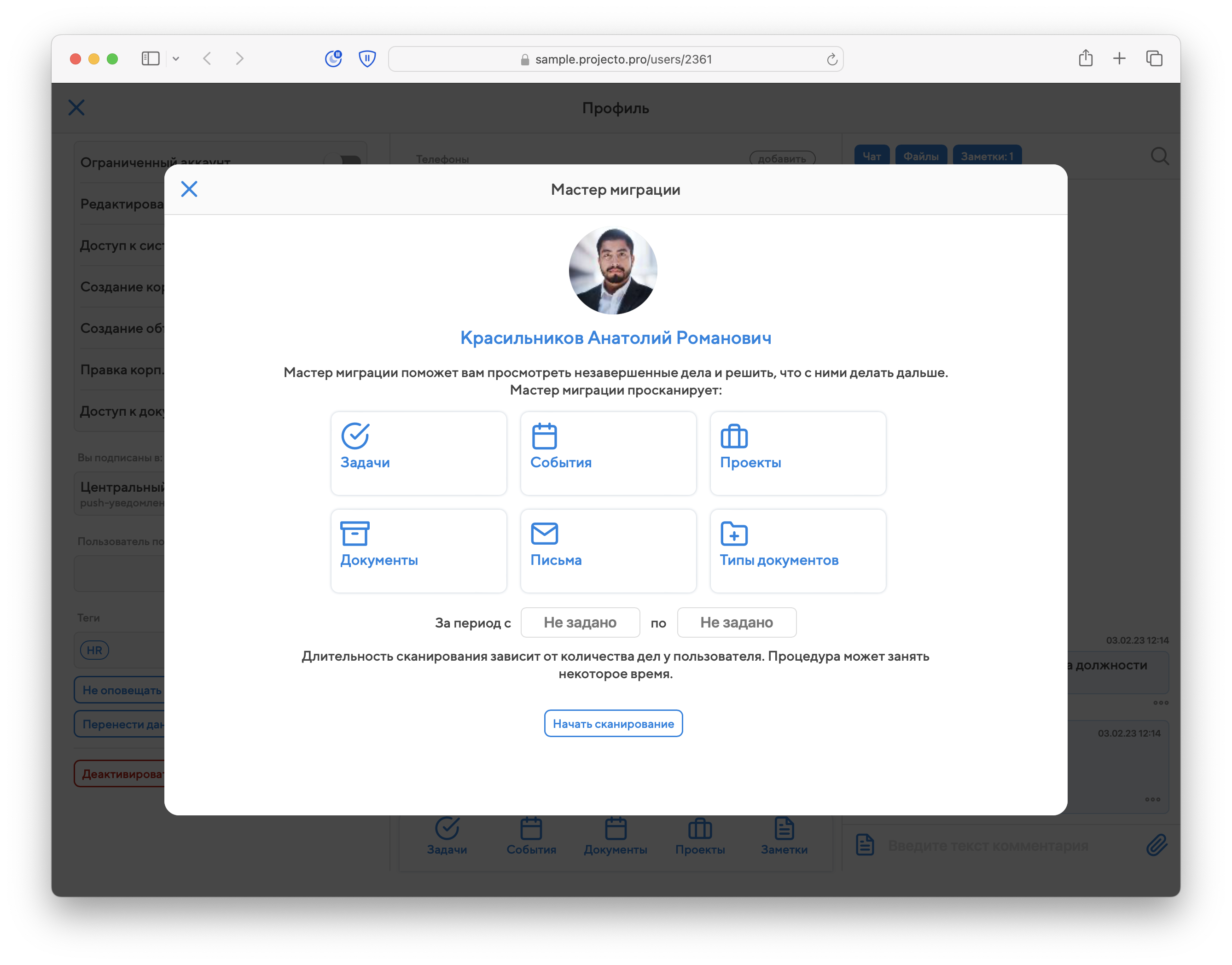 В этом окне можно настроить интервал, в период которого создавались сущности, либо посмотреть их за весь период. После нажатия на кнопку «Начать сканирование» начинается подсчет количества сущностей, доступных для переноса. Длительность сканирования зависит от количества сущностей у просматриваемого вами пользователя.
