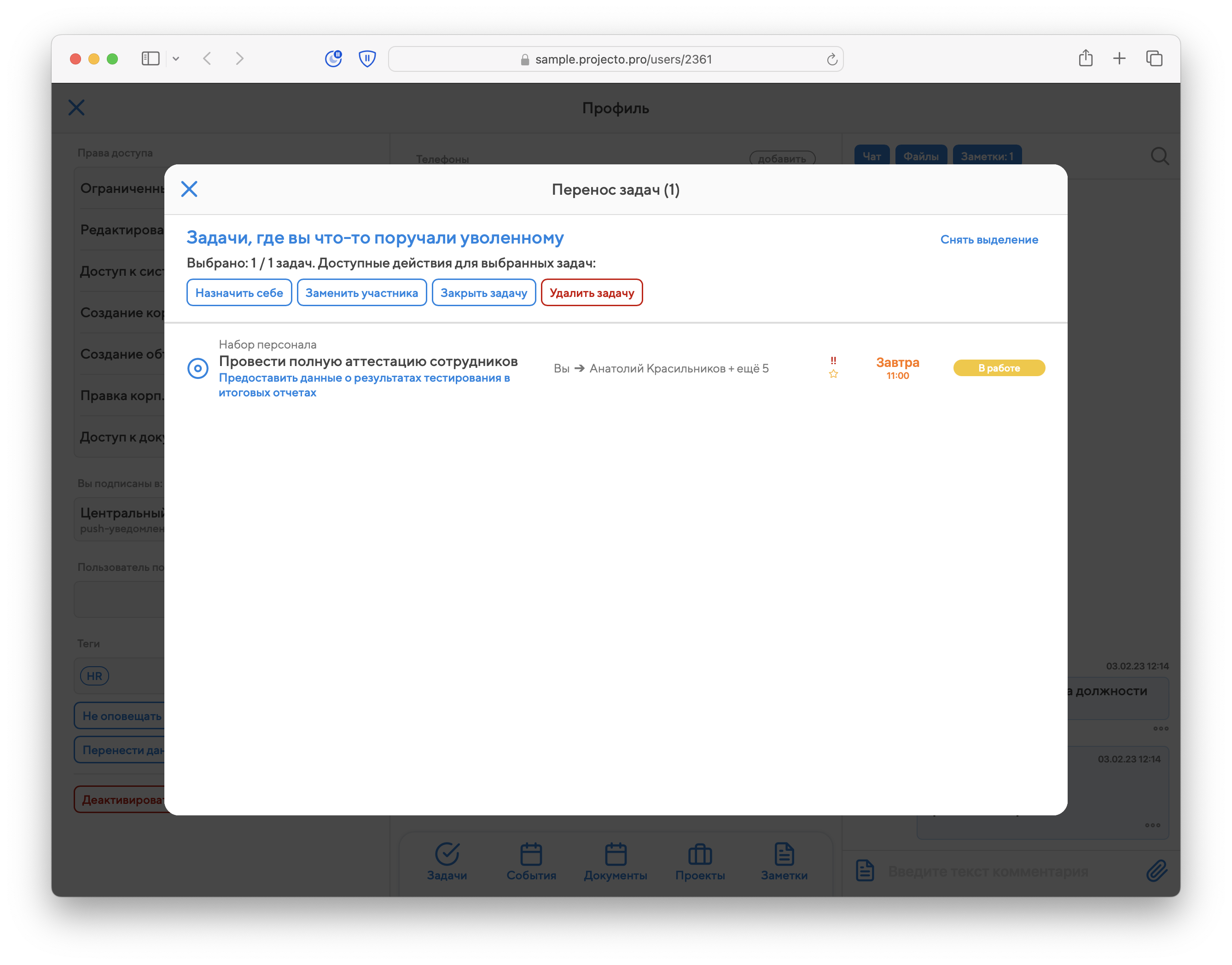 Вы можете перенести на себя, назначить другого исполнителем/участником или же удалить сущности. После того, как вы выбрали, что хотите сделать с найденными сущностями, достаточно просто закрыть окно и перейти к другому блоку мастера миграции. Не обязательно разбирать всё найденное за один сеанс работы: вы можете перенести только часть самых срочных дел, а остальное разобрать при следующем запуске мастера миграции.