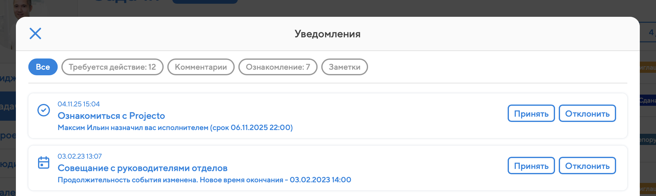 В таких уведомлениях всегда есть кнопки с доступными вариантами действий. Пока вы не нажмёте на какую-нибудь из них, уведомление не исчезнет. Количество уведомлений, требующих вашего действия, отображается в виде цифры на значке в правом верхнем углу экрана (к нему также прибавляется число непрочитанных вами корпоративных объявлений).