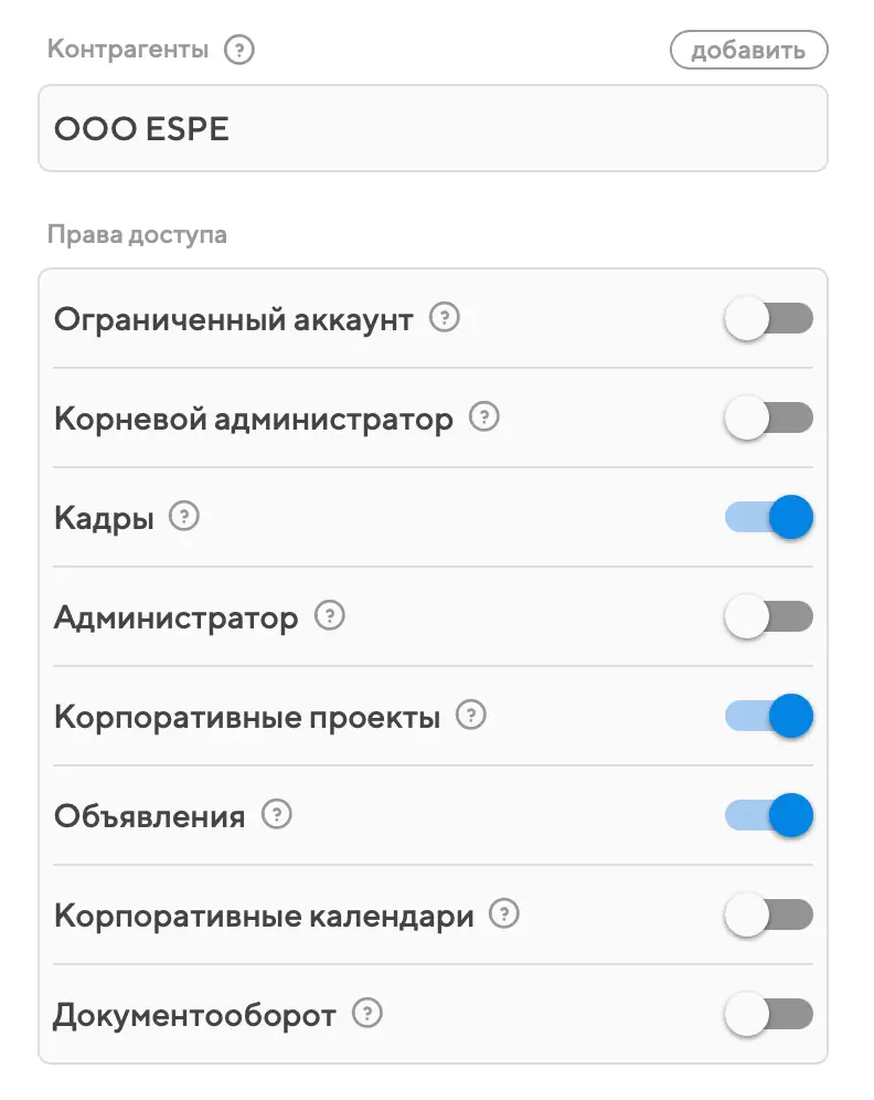 Ниже в левой колонке можно посмотреть, с какими юрлицами связан пользователь и какие у него есть права. Если у вас есть права корневого администратора, директора или HR, вы сможете редактировать эти блоки.