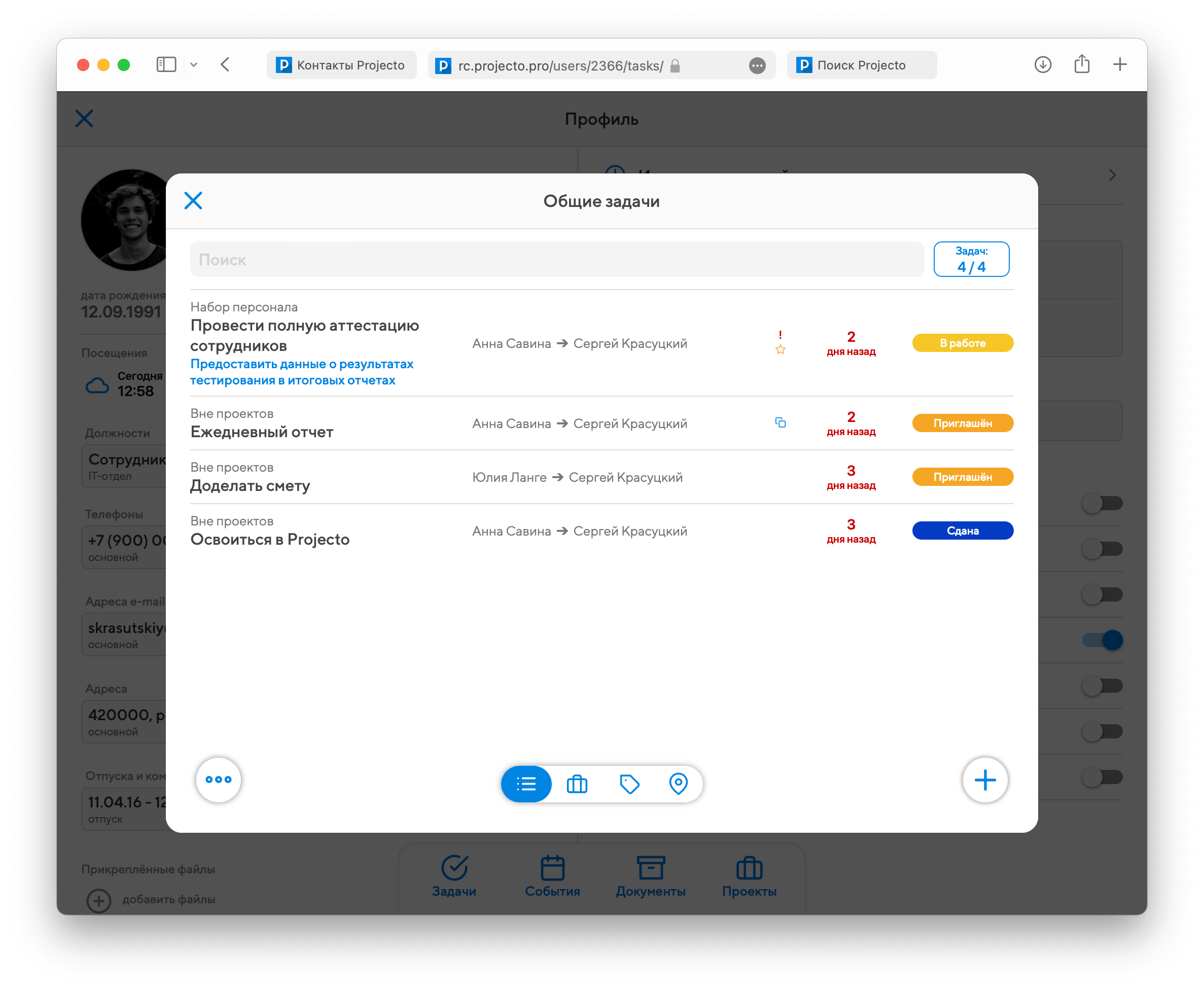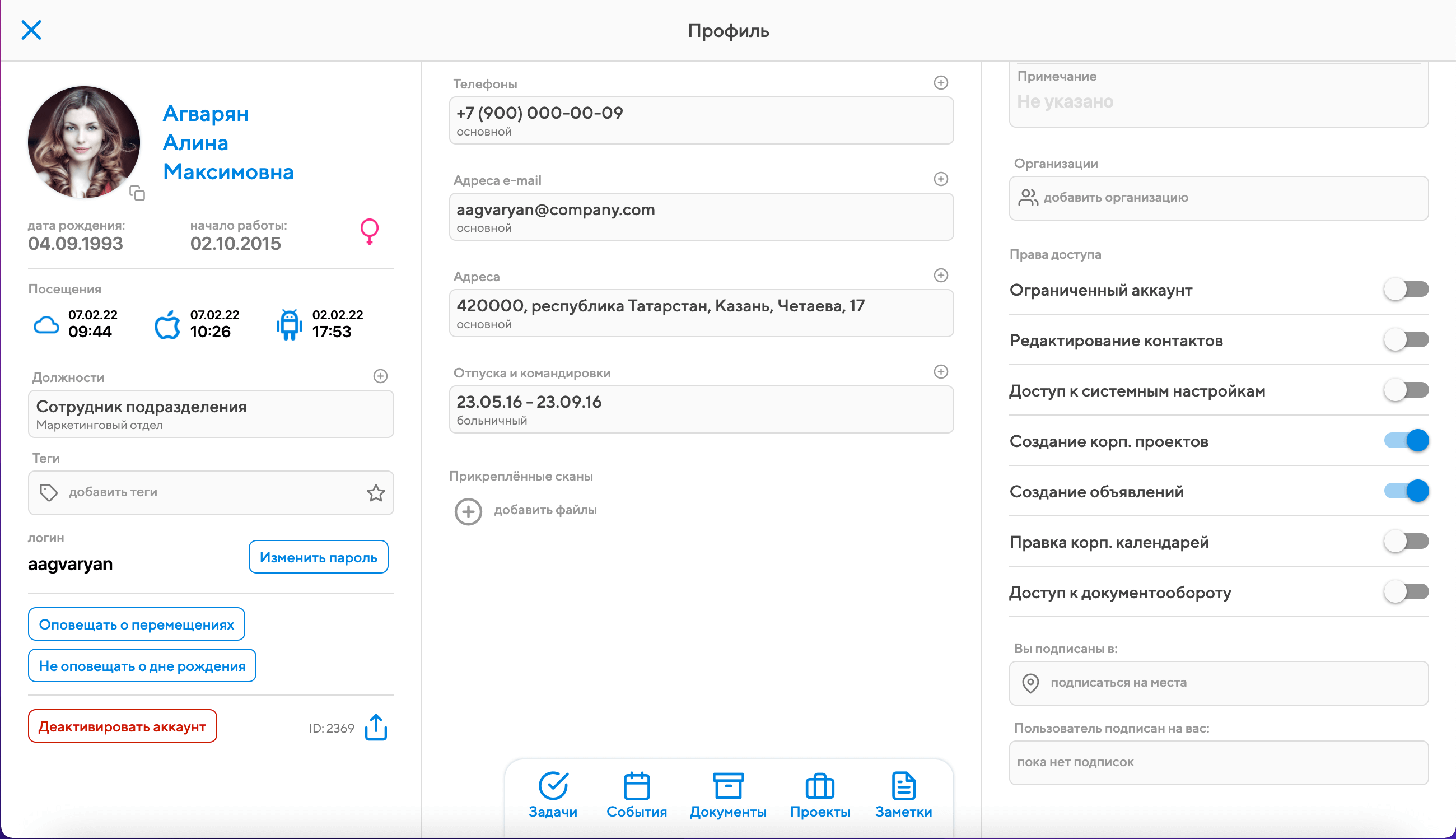 Здесь отображается основная информация по пользователю – аватар (фото), должности, отдел, даты рождения и начала работы в компании, контактная информация. Здесь же можно посмотреть, на каких платформах человек пользуется Projecto – например, когда он в последний раз заходил в iOS- или Android-приложение сервиса: