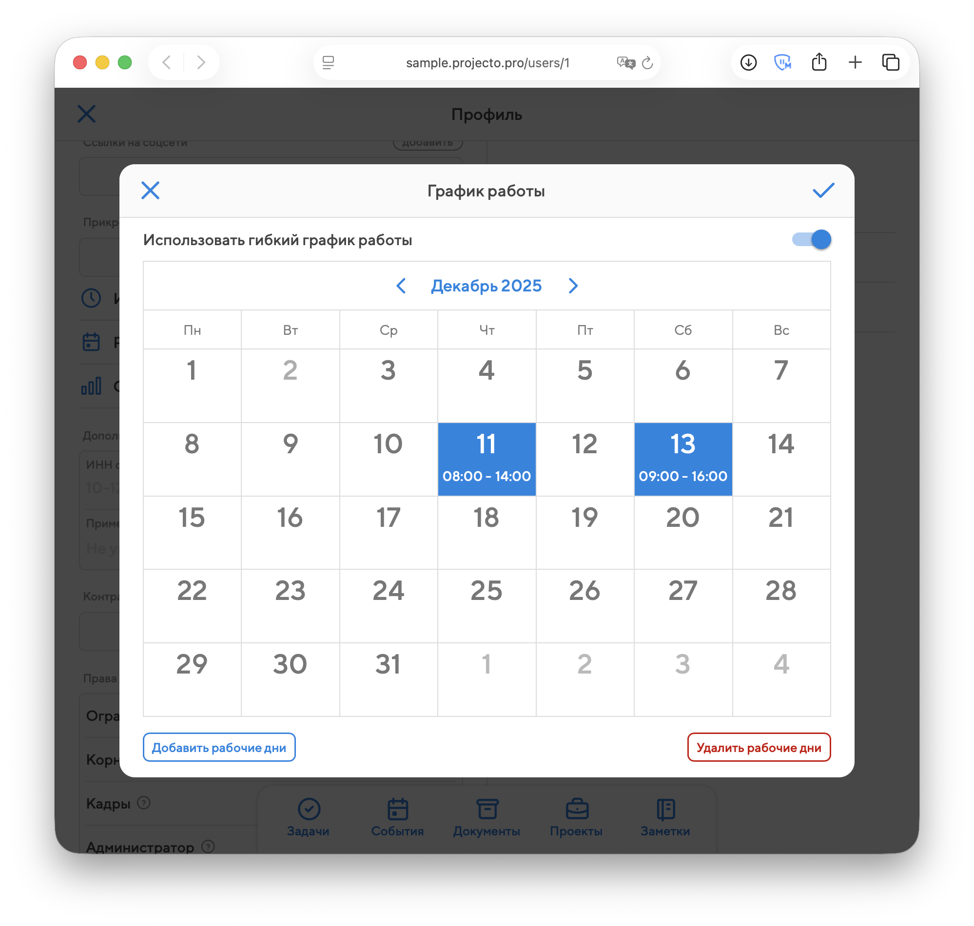 В разделе "Рабочий график" можно управлять рабочим временем. Для обычного рабочего графика можно указать начало и окончание рабочего дня, а для гибкого графика – еще и рабочие дни в календарной сетке.
