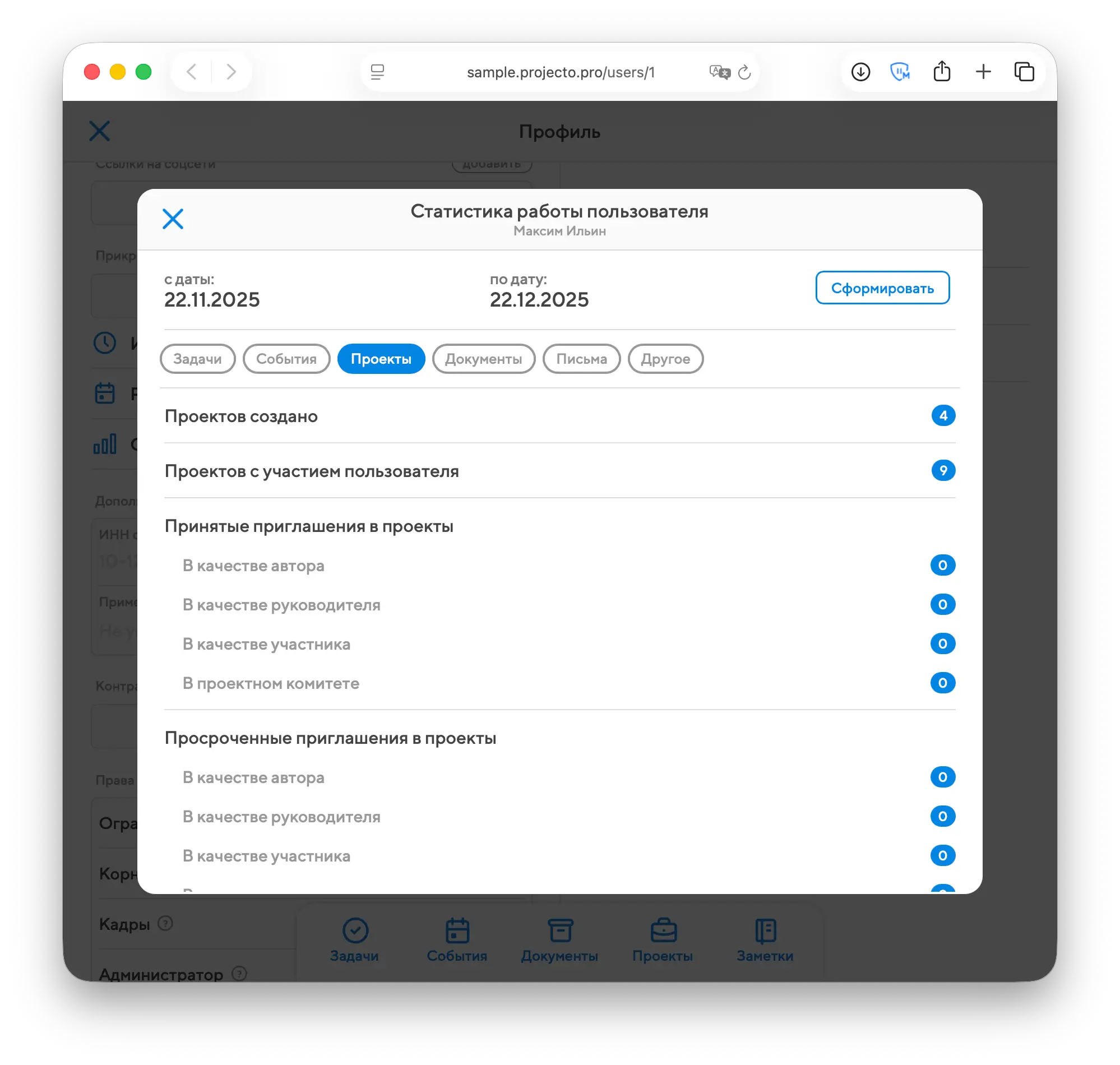 Раздел "Статистика работы" позволяет собрать сводку о работе сотрудника за выбранный период. Функция ориентирована прежде всего на руководителей, но можно посмотреть и статистику по самому себе.