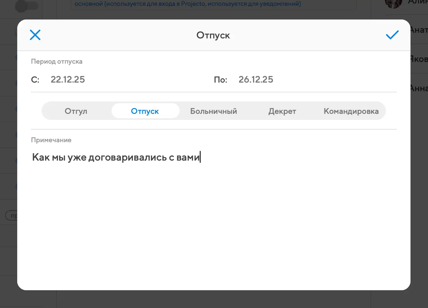 Если администраторы вашей базы Projecto разрешили сотрудникам самостоятельное управление отпусками, в собственном профиле в блоке "Отпуска и командировки" вы сможете внести сведения о предстоящих отпусках. Они будут отправлены на согласование вашему непосредственному руководителю.