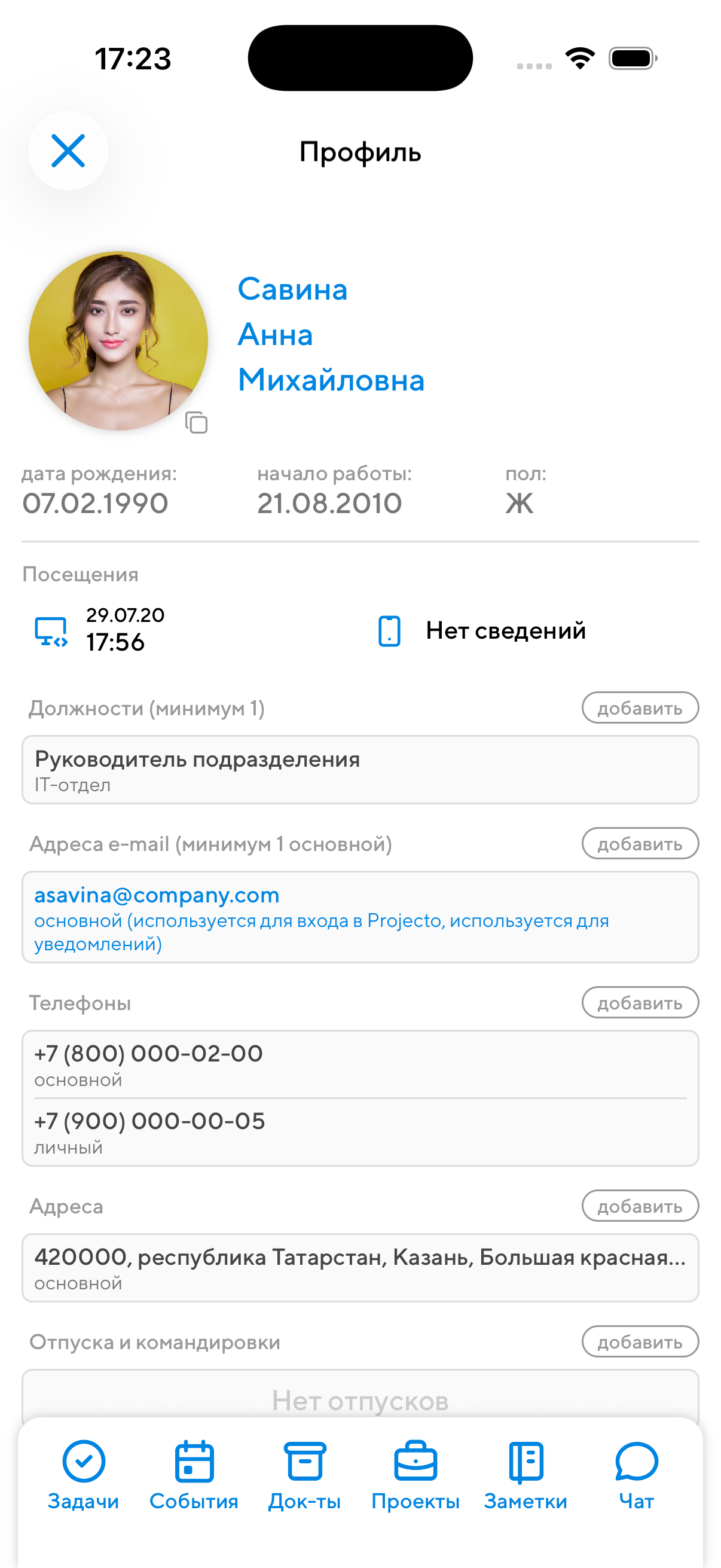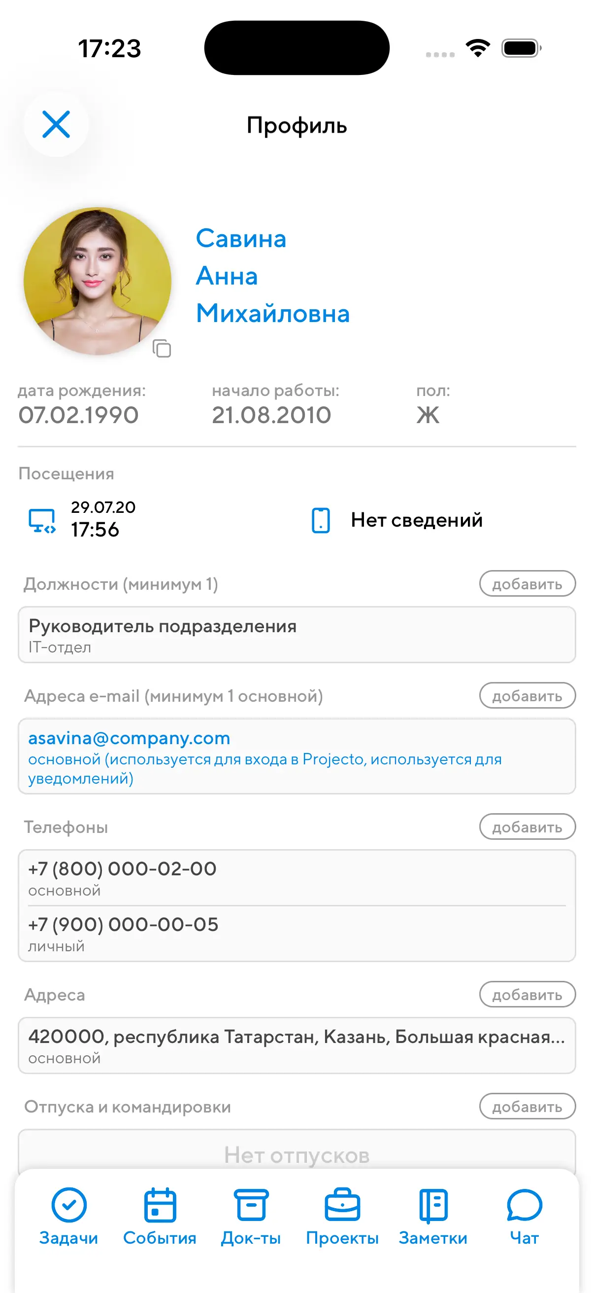 Здесь отображается основная информация по пользователю – аватар (фото), должности, отдел, даты рождения и начала работы в компании, контактная информация. Здесь же можно посмотреть, на каких платформах человек пользуется Projecto – например, когда он в последний раз заходил в iOS- или Android-приложение сервиса.