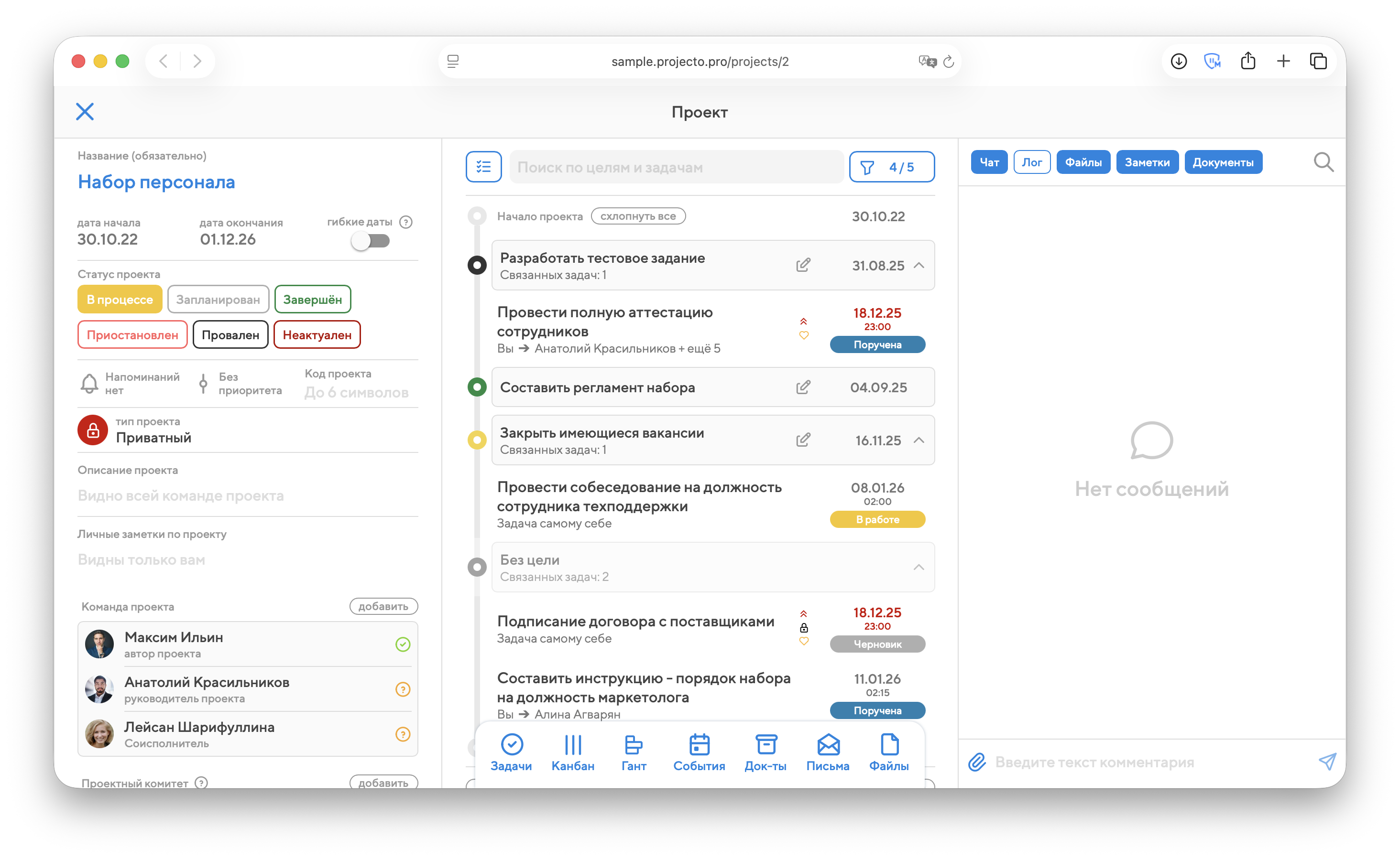 В центральной колонке будут показаны все цели и задачи проекта, а внизу по центру вы увидите переключатель разделов проекта: