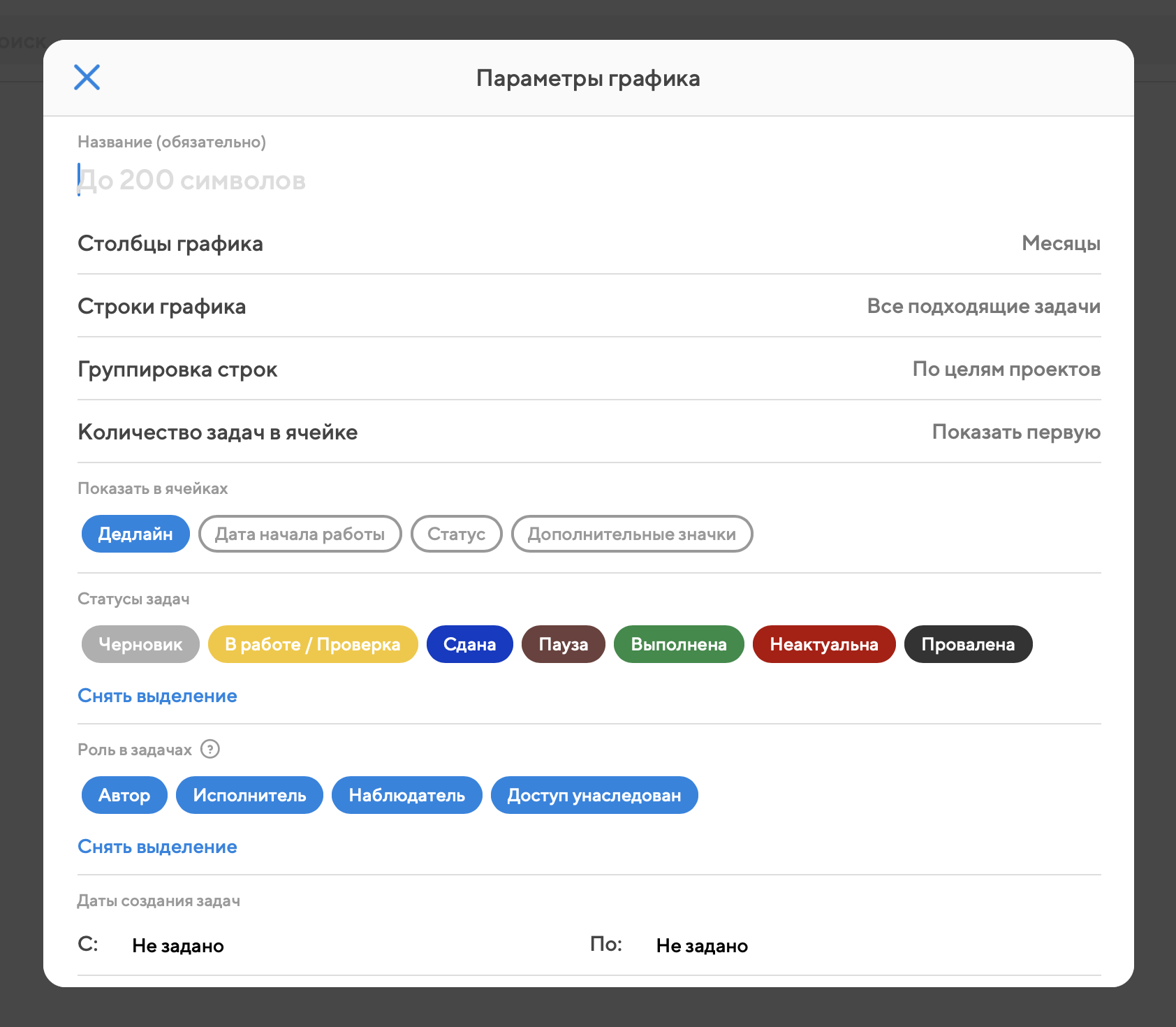 Календарные графики проекта создаются в одноименном блоке в левой колонке проекта. В проекте может быть сколько угодно таких графиков с разными настройками.