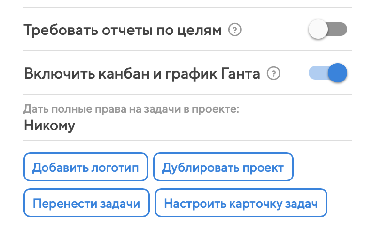 На крупных экранах в нижнем переключателе вы также увидите кнопки специальных инструментов проектного управления. Чтобы в проекте стал доступен канбан или график Ганта, в левой колонке автор или руководитель проекта должны активировать переключатель "Включить канбан и график Ганта".