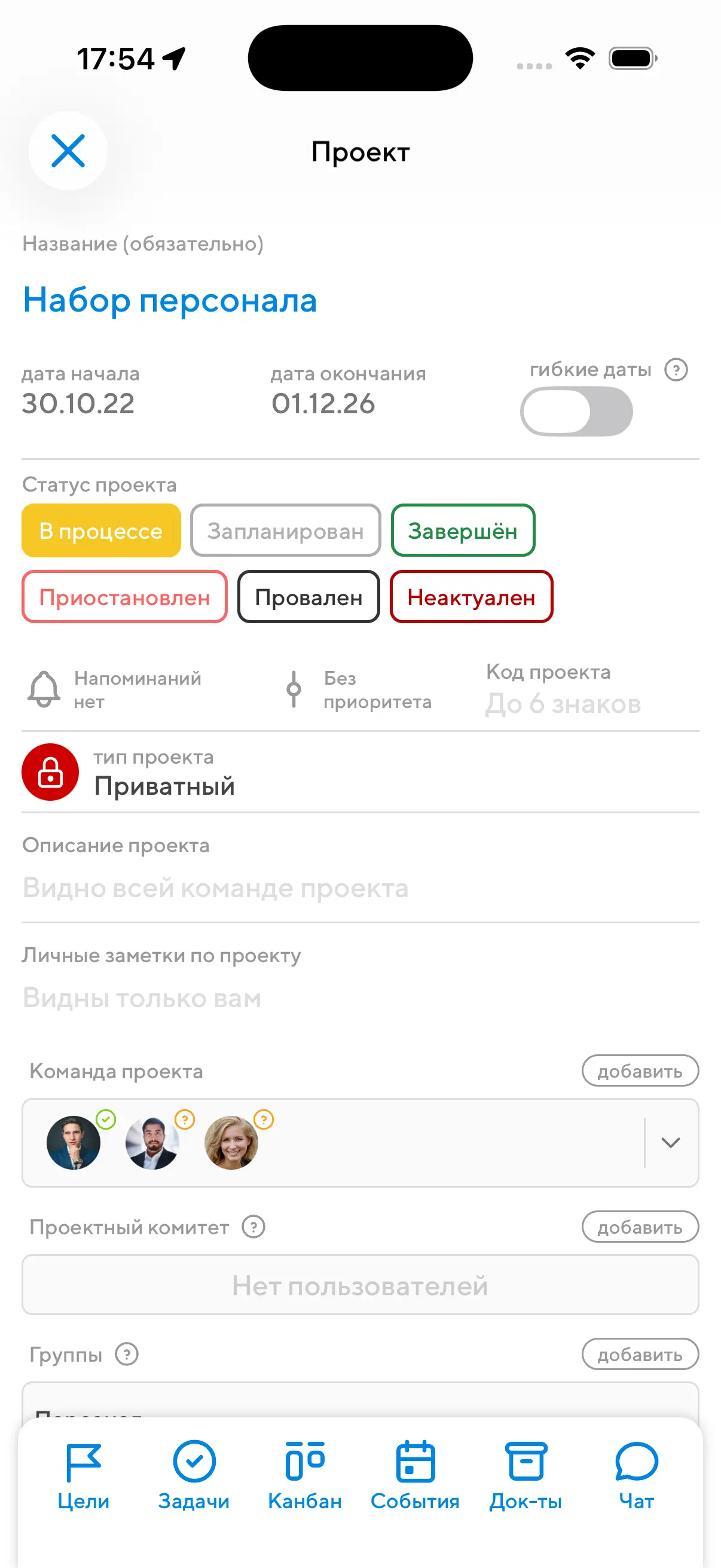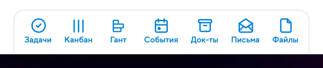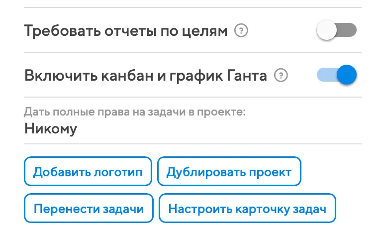 На крупных экранах в нижнем переключателе вы также увидите кнопки специальных инструментов проектного управления. Чтобы в проекте стал доступен канбан или график Ганта, в левой колонке автор или руководитель проекта должны активировать переключатель "Включить канбан и график Ганта".