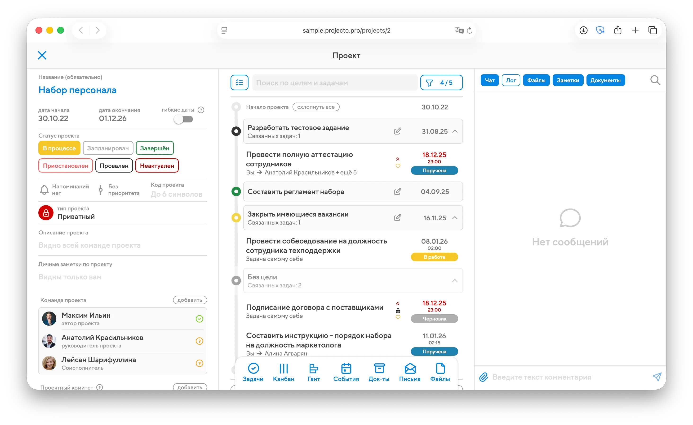 В центральной колонке будут показаны все цели и задачи проекта, а внизу по центру вы увидите переключатель разделов проекта: