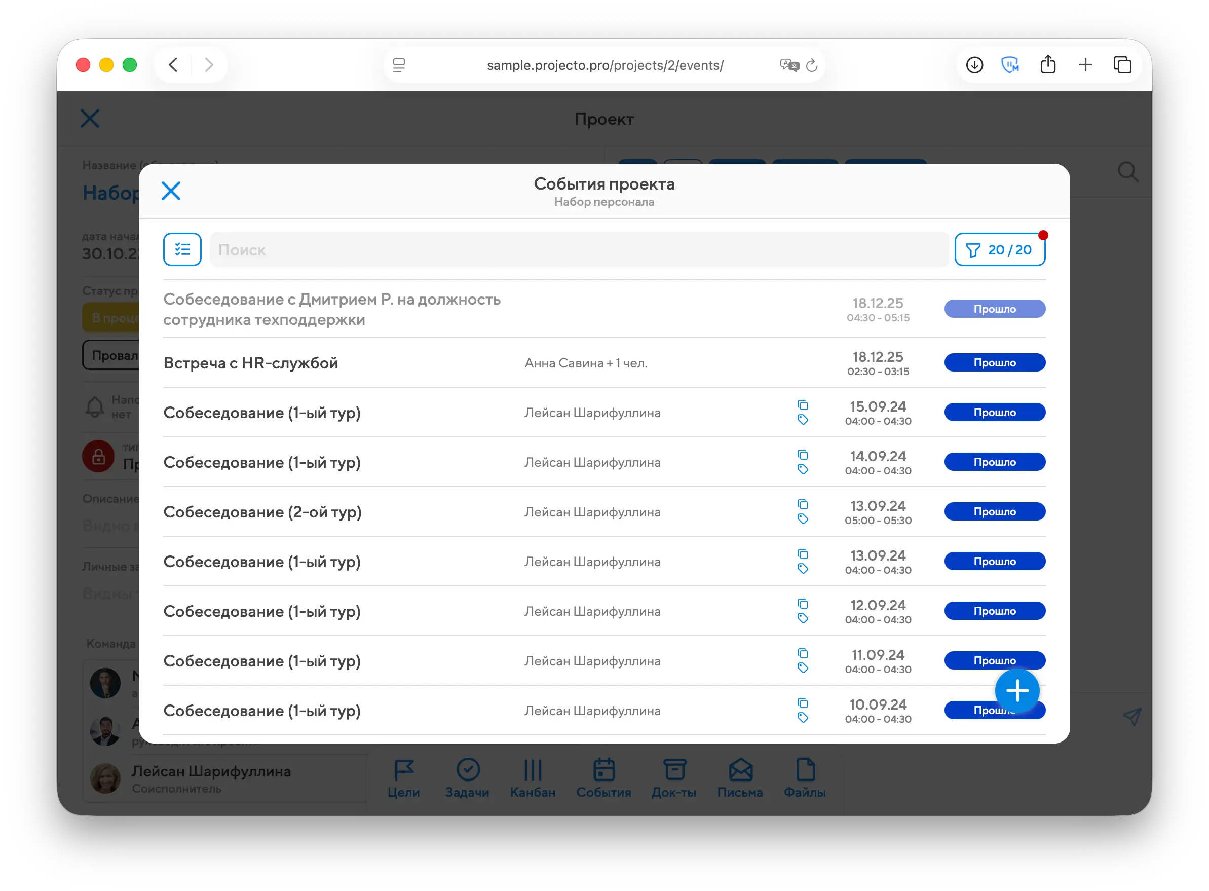 Переключаясь между вкладками задач, событий, документов и писем, вы будете видеть всплывающие окна со списками связанных с проектом данных: