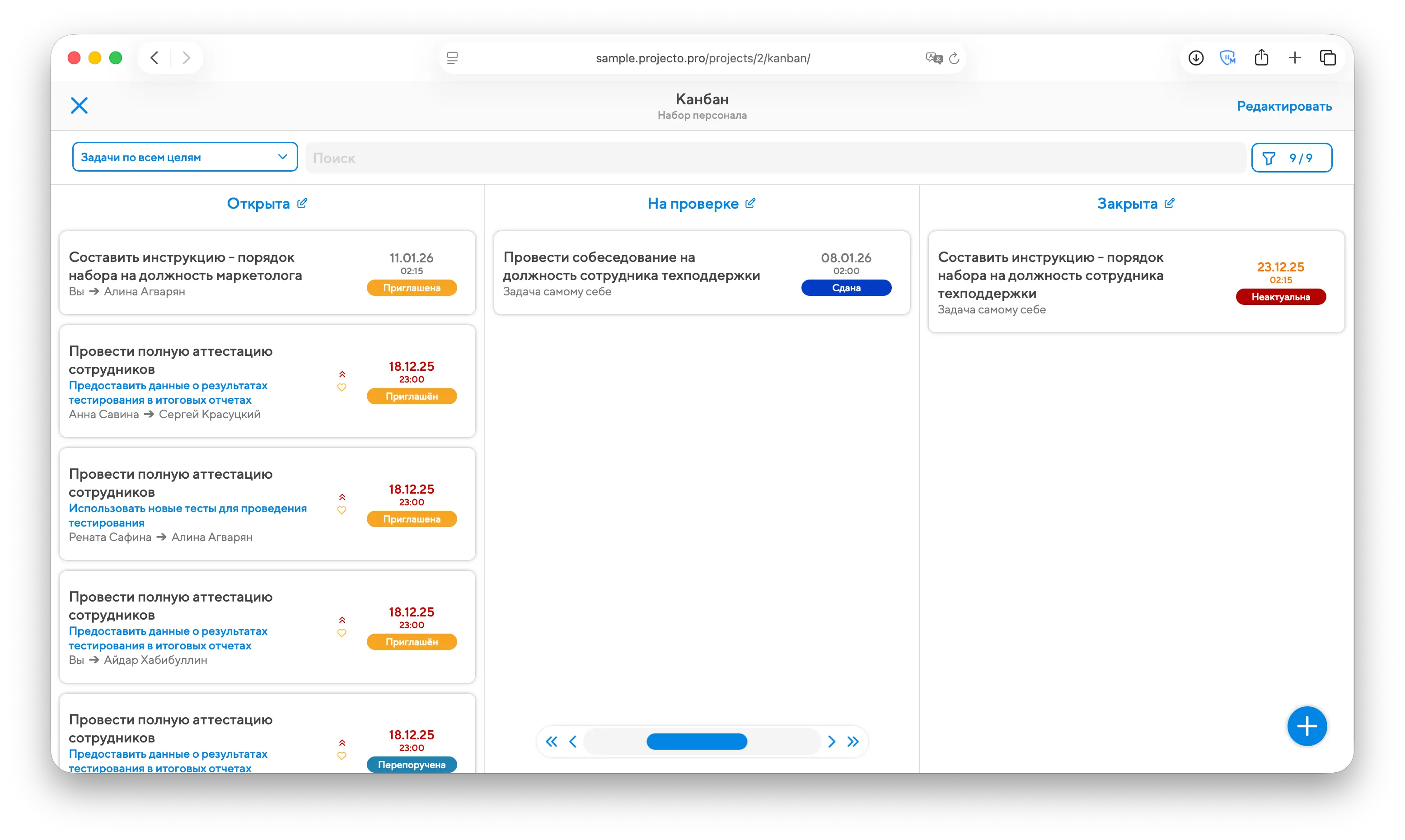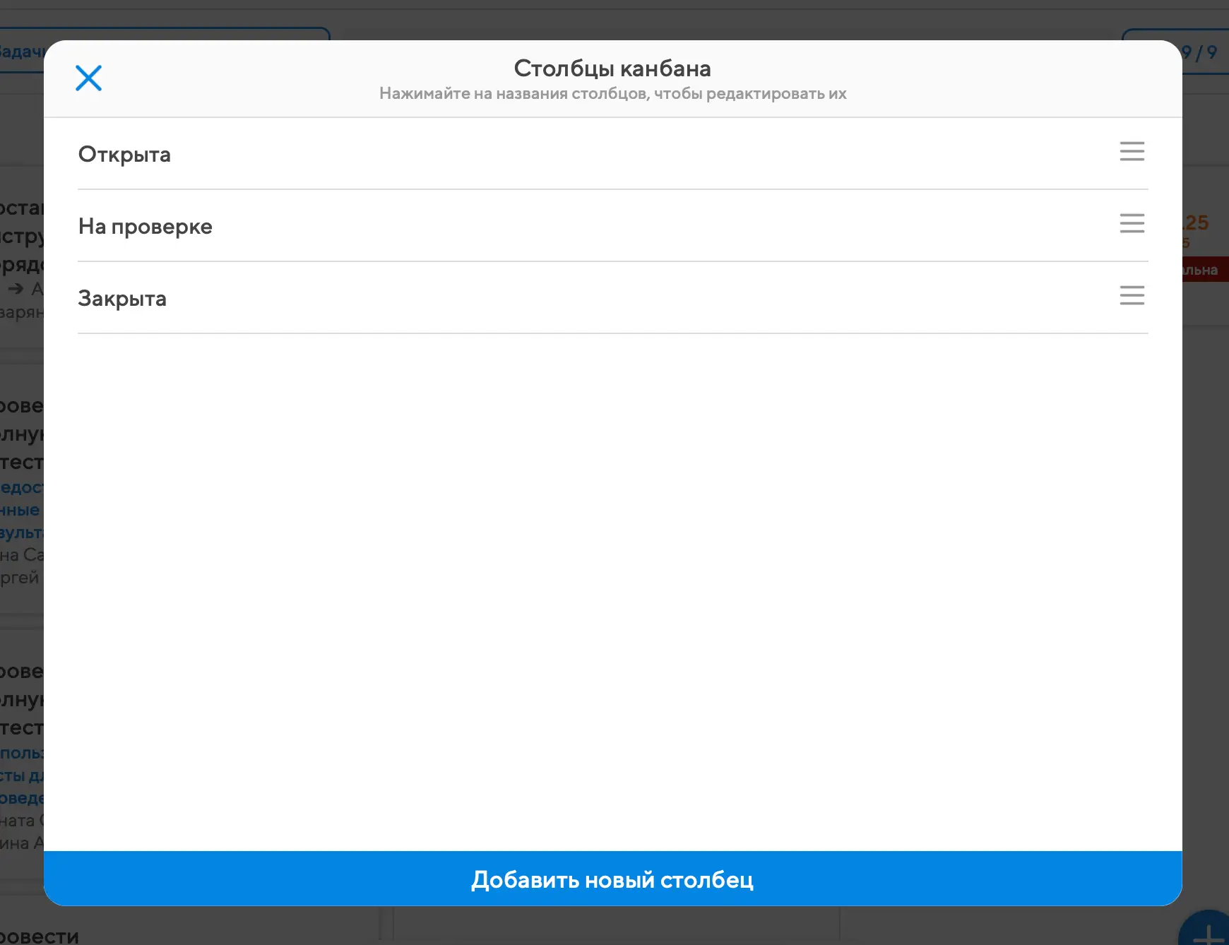 Любой проектный канбан свободно настраивается. Автор или руководитель проекта может нажать на кнопку "Редактировать" в правом верхнем углу и увидит окно, в котором сможет переставлять столбцы или создать новый столбец: