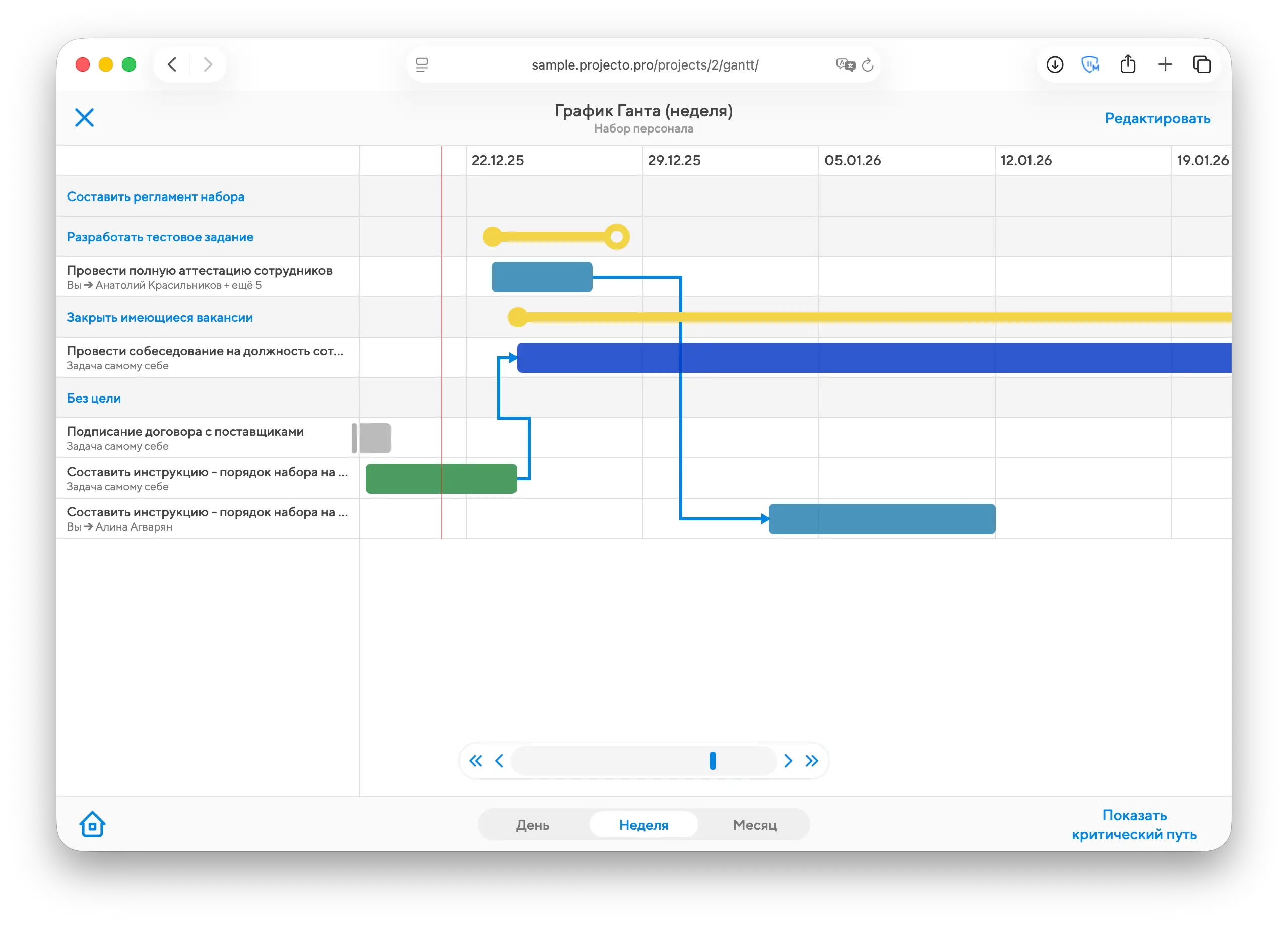 График Ганта - еще один способ отследить выполнения задач проекта. Для каждой задачи будет показан цветной блок (соответственно статусу задачи) от даты её создания до запланированного срока выполнения, а зависимости между задачами обозначаются стрелками, указывая на порядок, в котором должна выполняться работа.