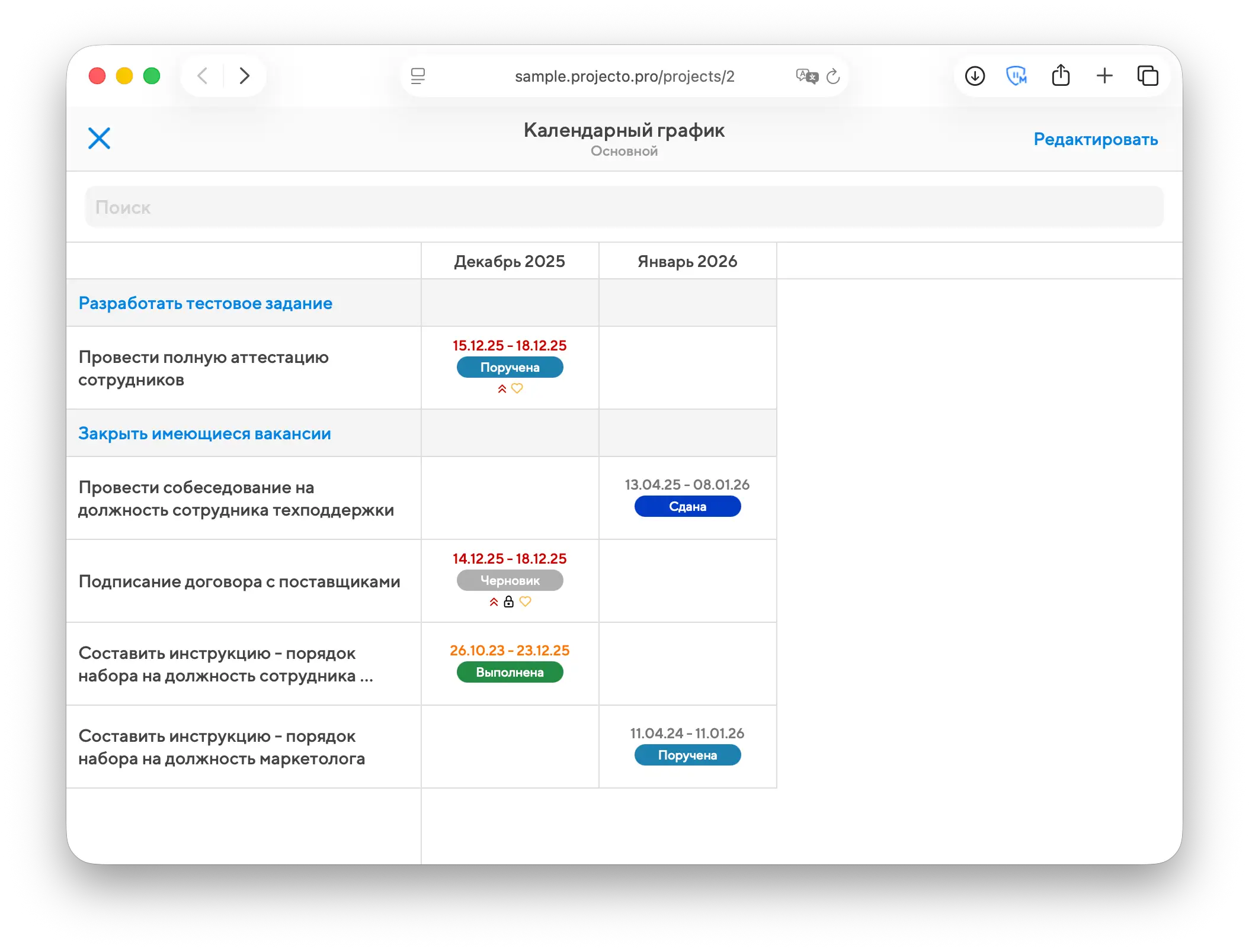 Календарный график - в этом режиме строится большая таблица, по строкам которой отложены все задачи, а по столбцам – месяцы. В ячейках на пересечении строк и столбцов показываются статусы задач. Такой режим удобен для контроля проектов, по которым превалируют повторяющиеся задачи – так руководитель сразу будет видеть динамику выполнения таких задач от месяца к месяцу.