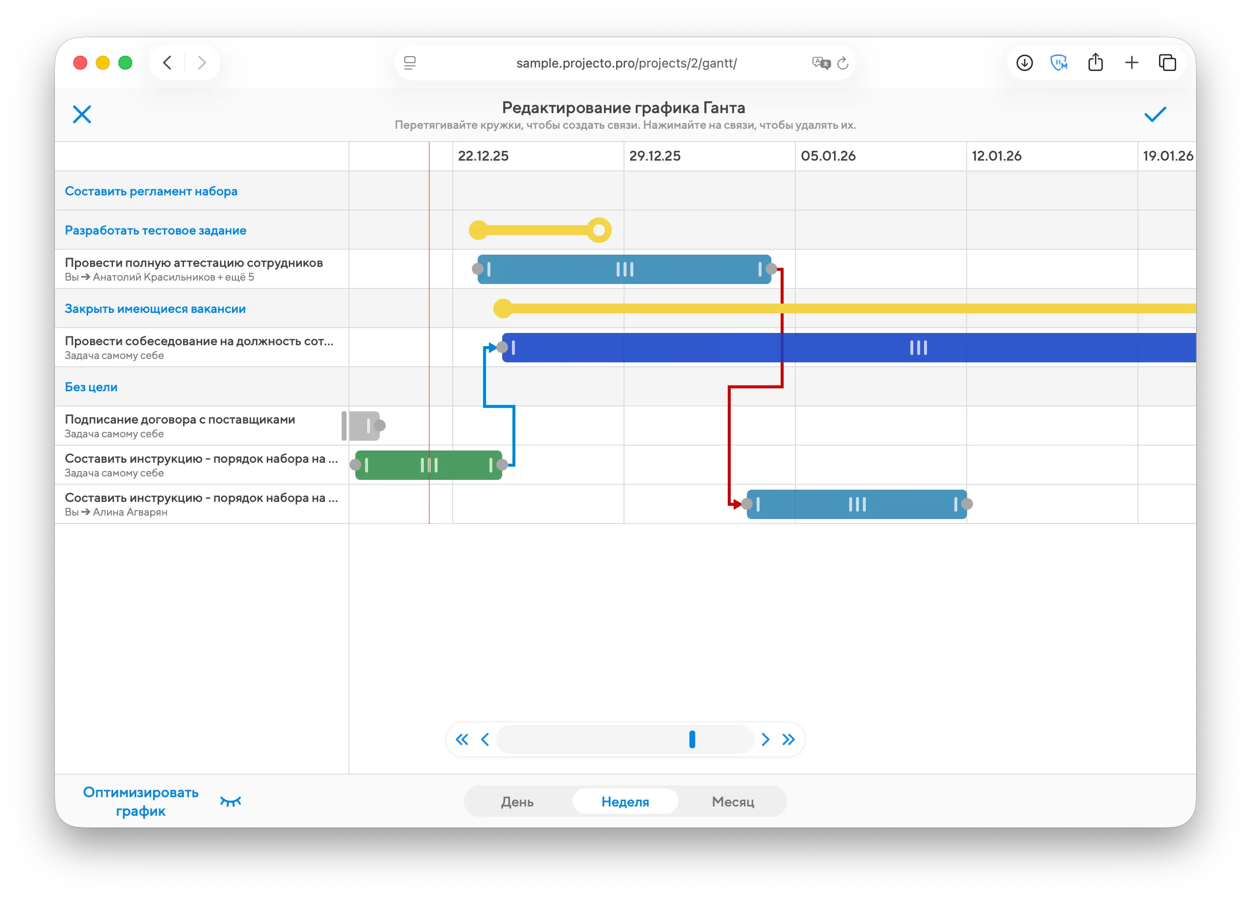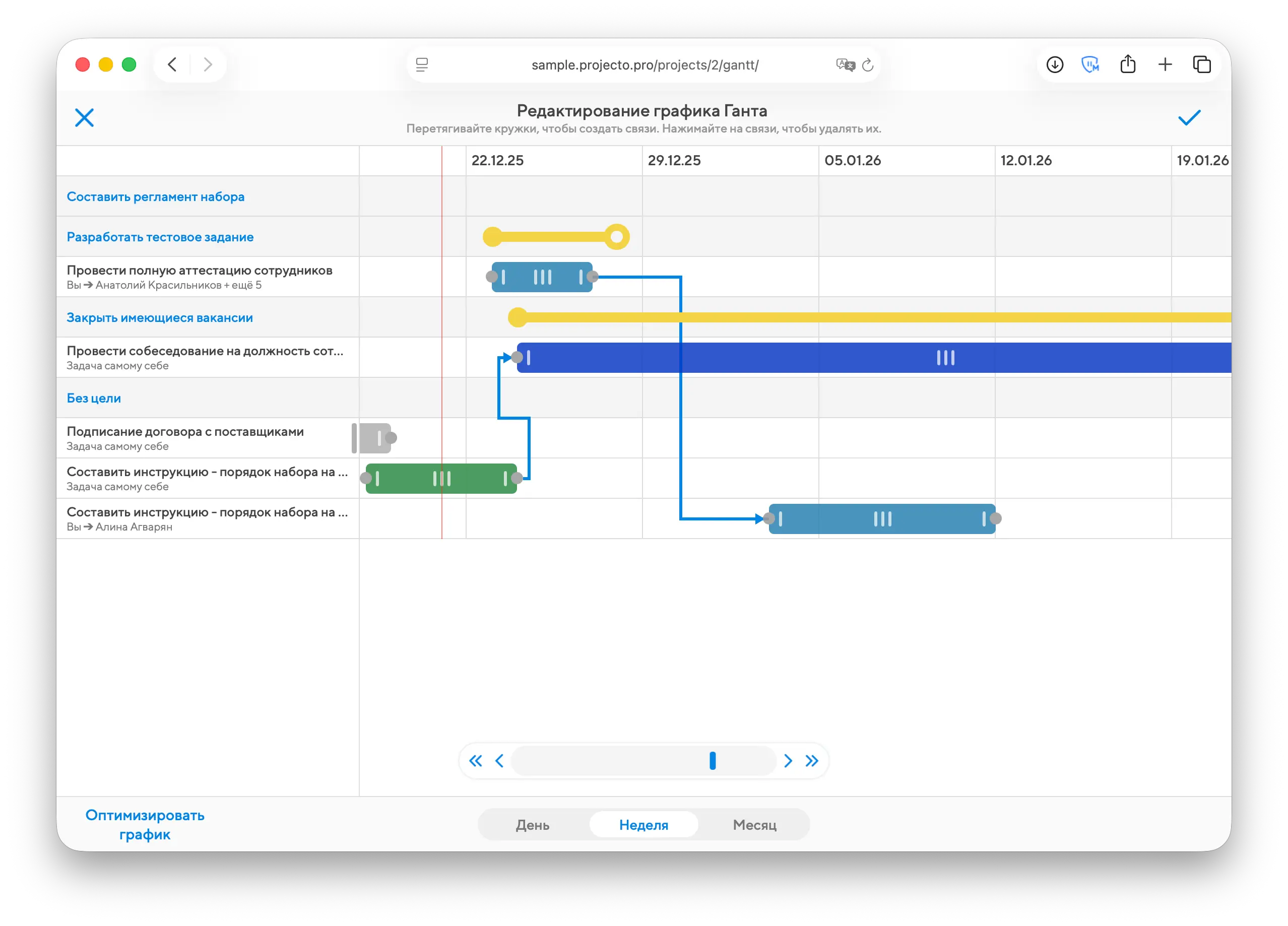 Связи между задачами можно задавать и удалять не только внутри их модальных окон, но и рисуя стрелки в режиме редактирования графика.
