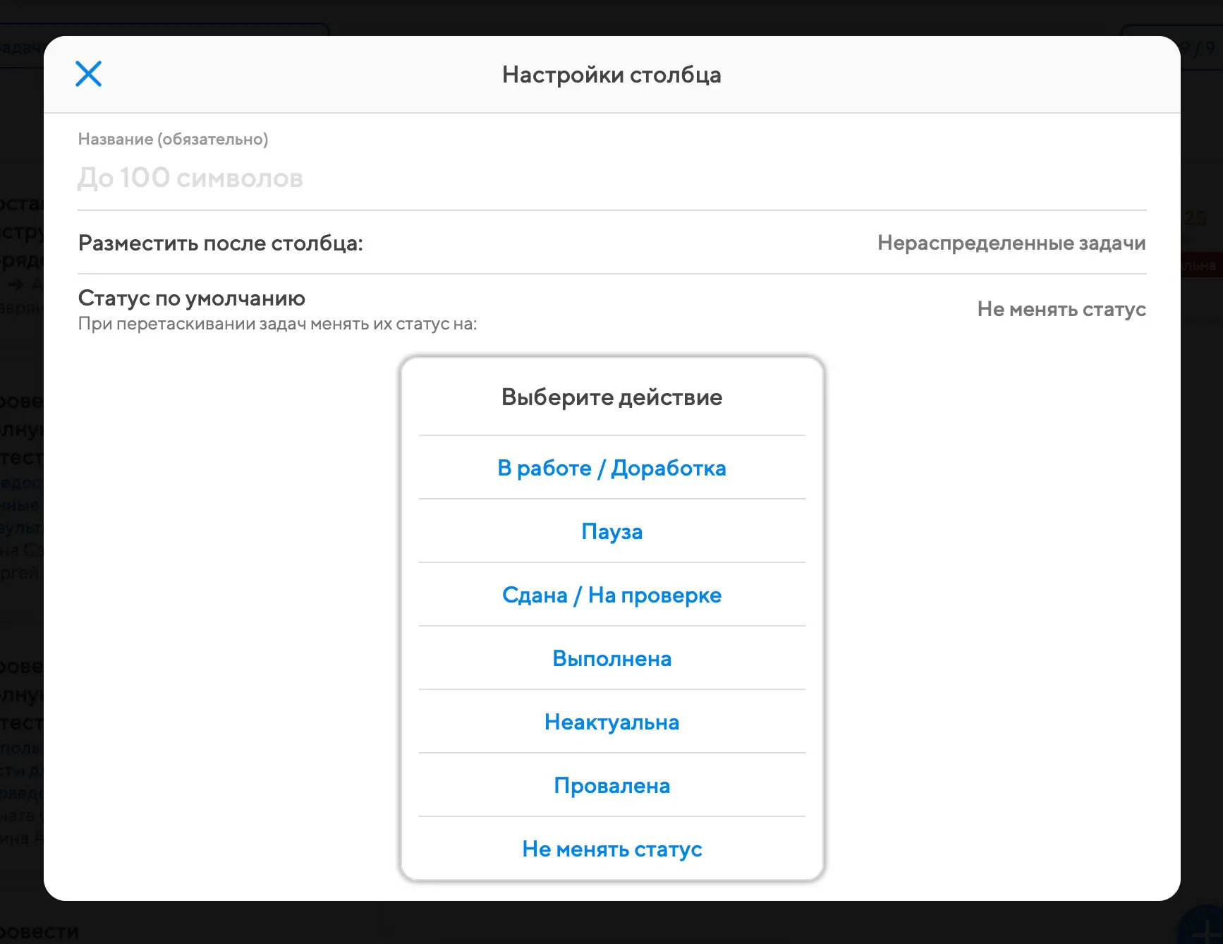 При создании столбца можно (при желании) указать для него статус по умолчанию, в который будут переходить все задачи и подзадачи, перемещаемые в этот столбец канбана.
