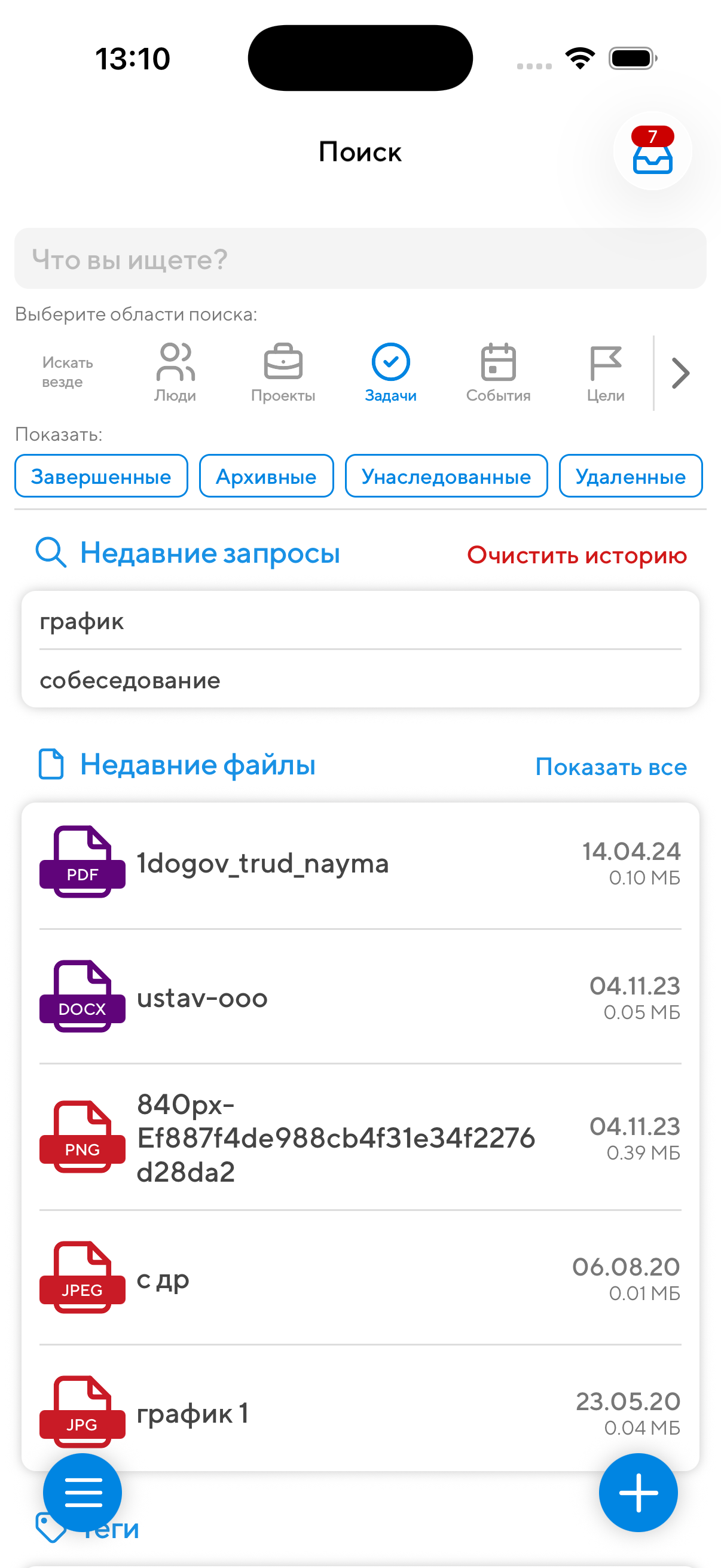 После ввода поискового запроса и нажатия на клавишу Enter появляется всплывающий список с результатами поиска, отсортированный по убыванию даты создания сущности. Список результатов разделен на секции: задачи, события, заметки и т.д. Поиск происходит по всем сущностям, к которым вы имеете доступ.