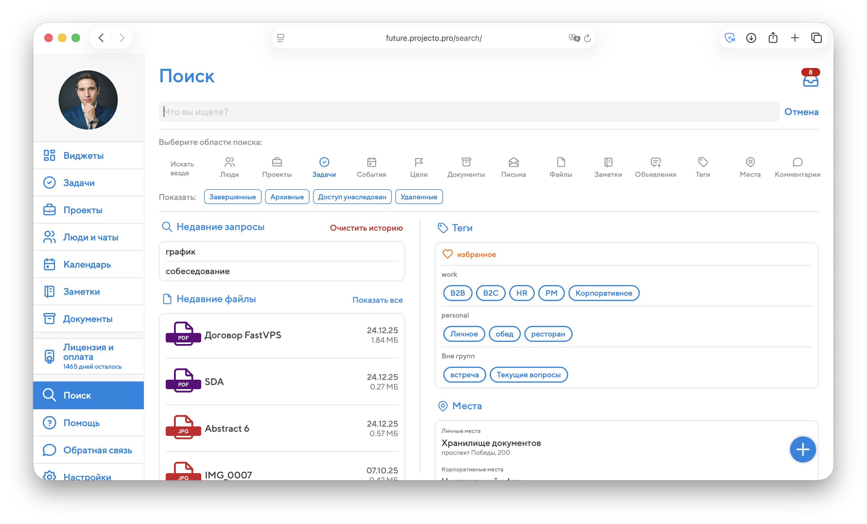Для поиска сразу по всей информации в Projecto пользуйтесь универсальным полем поиска в разделе “Поиск”.