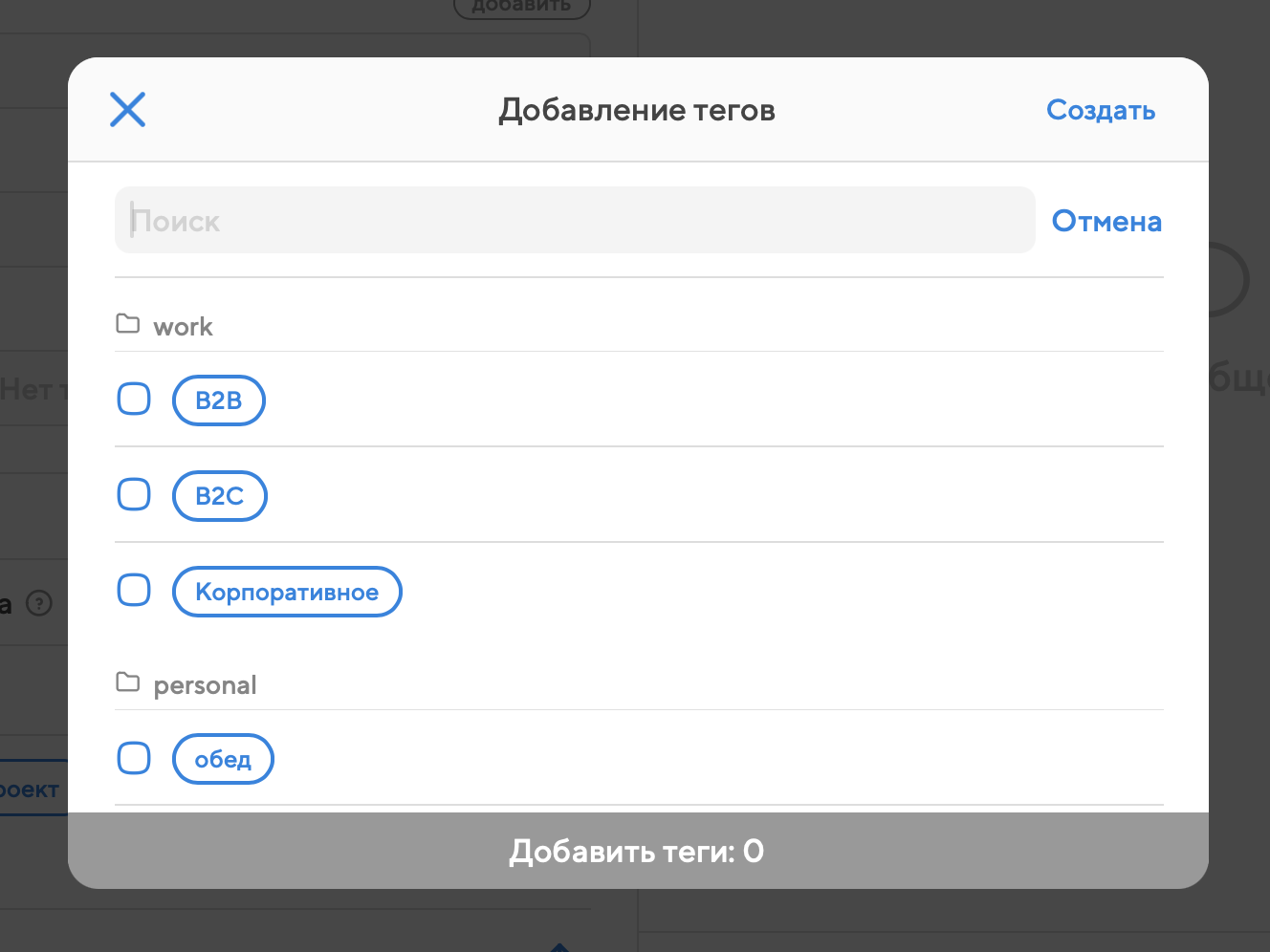 Создавать теги можно напрямую из окна редактирования задачи, события, проекта и пр.: