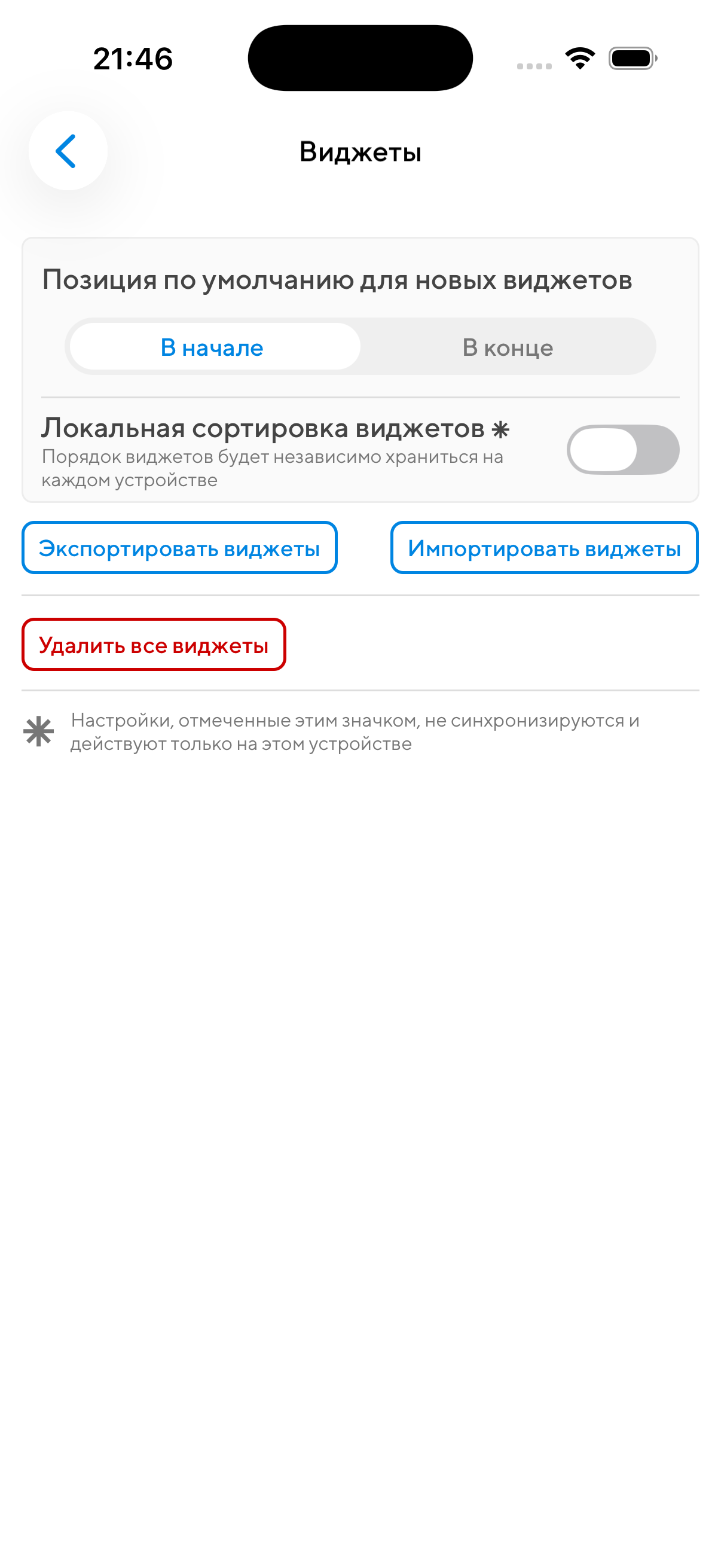 Во время экспериментов с настройкой виджетов, вам может пригодиться возможность сделать резервную копию вашего рабочего пространства, чтобы иметь возможность быстро восстановить её позже. Для этого воспользуйтесь кнопками экспорта/импорта виджетов в настройках Projecto в разделе "Виджеты":