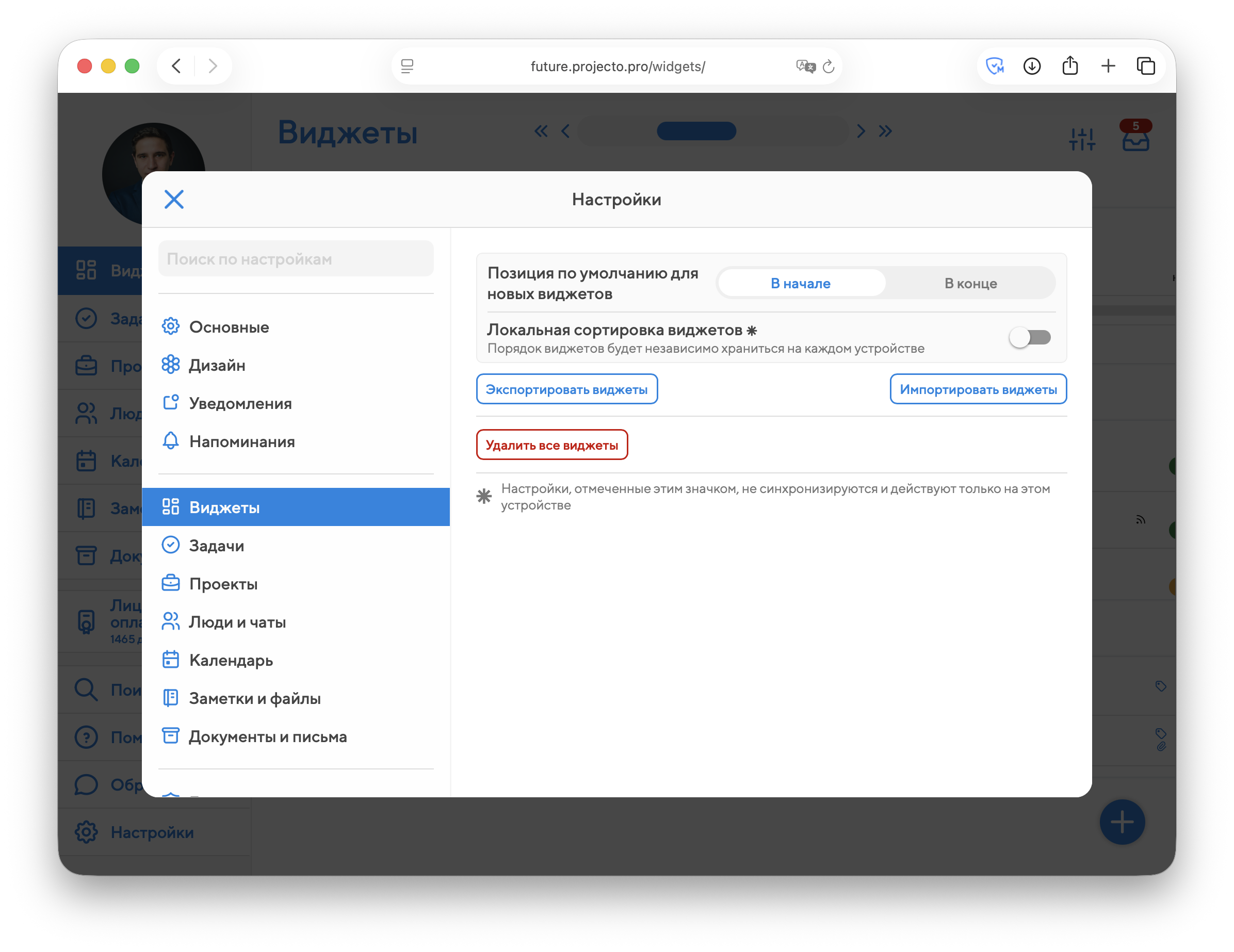 Импортировать виджеты необязательно на том же аккаунте Projecto. Например, вы можете поделиться своей конфигурацией виджетов с коллегами или подчиненными.