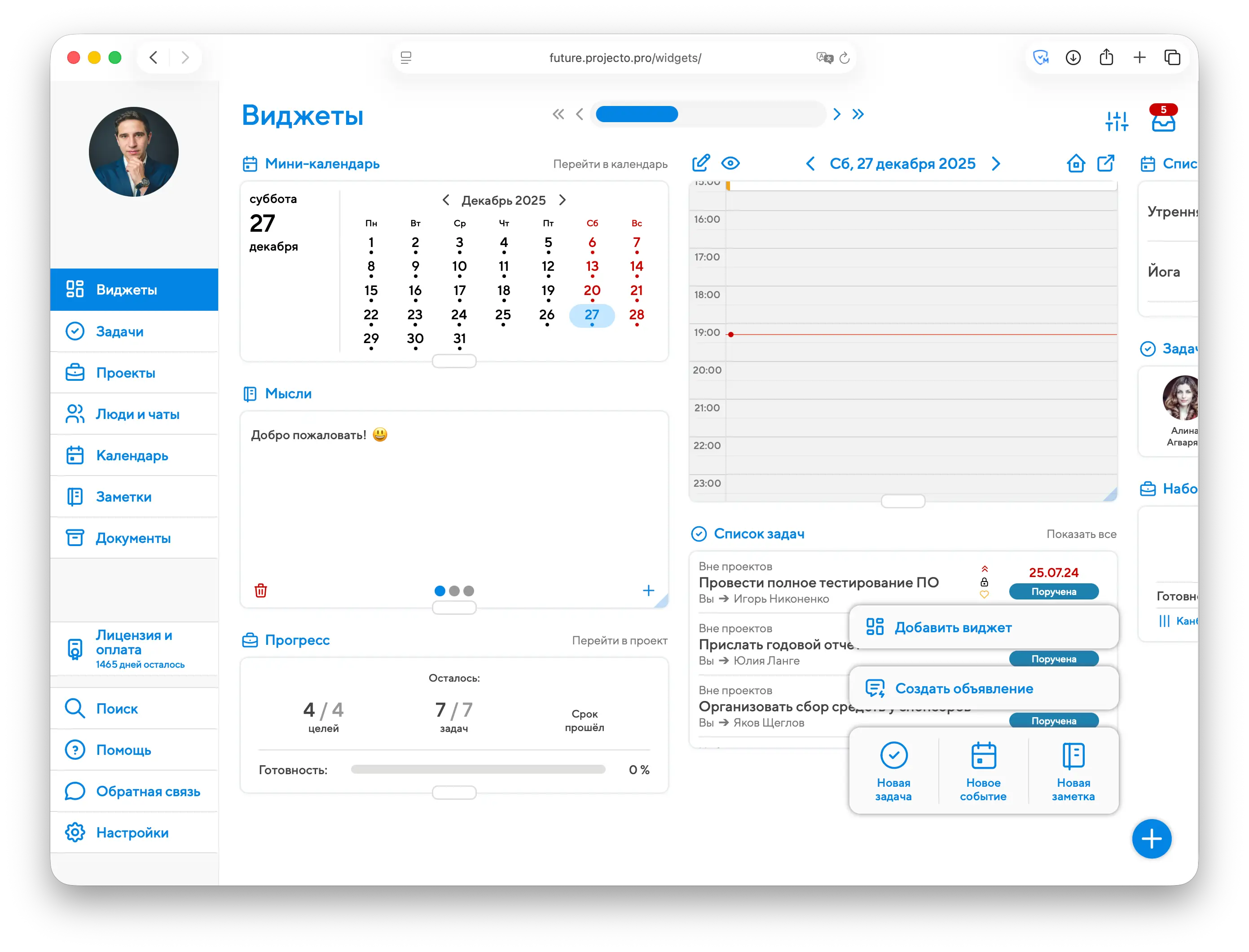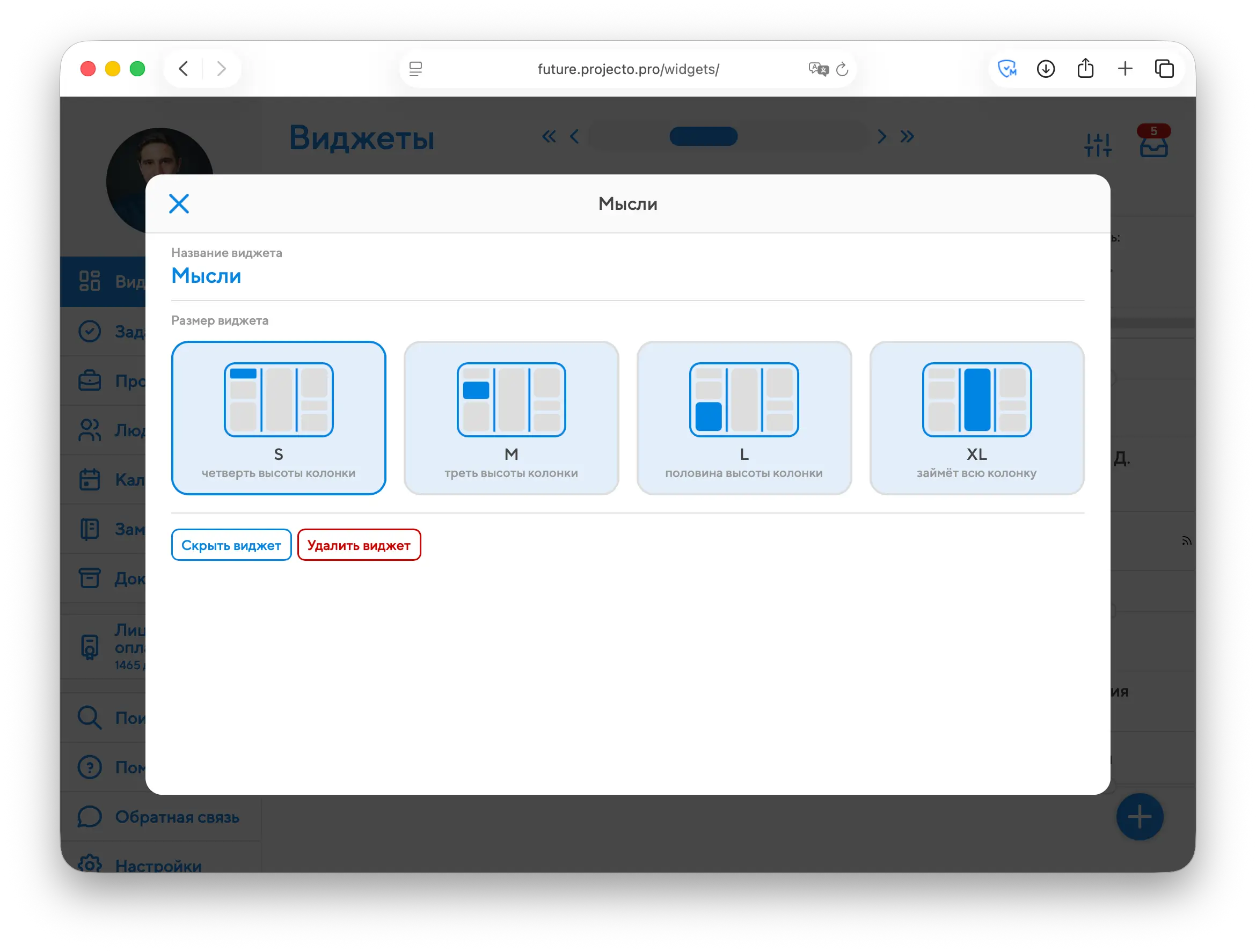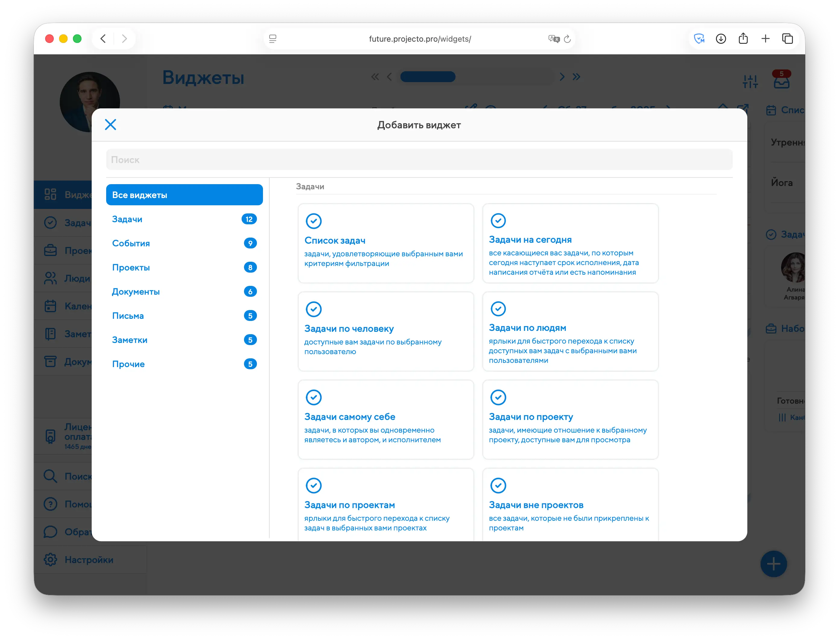 Именно поэтому в Projecto есть раздел Виджеты. Это универсальный dashboard, который создаёте лично вы исключительно под ваши собственные нужды. Раздел Виджеты состоит из виджетов, каждый из которых имеет множество настроек. Виджеты бывают разных размеров и форматов, и располагать вы их тоже можете в удобном вам порядке. Более того, настроенные вами виджеты синхронизируются между всеми вашими устройствами, и доступны абсолютно везде, где вы работаете с Projecto.