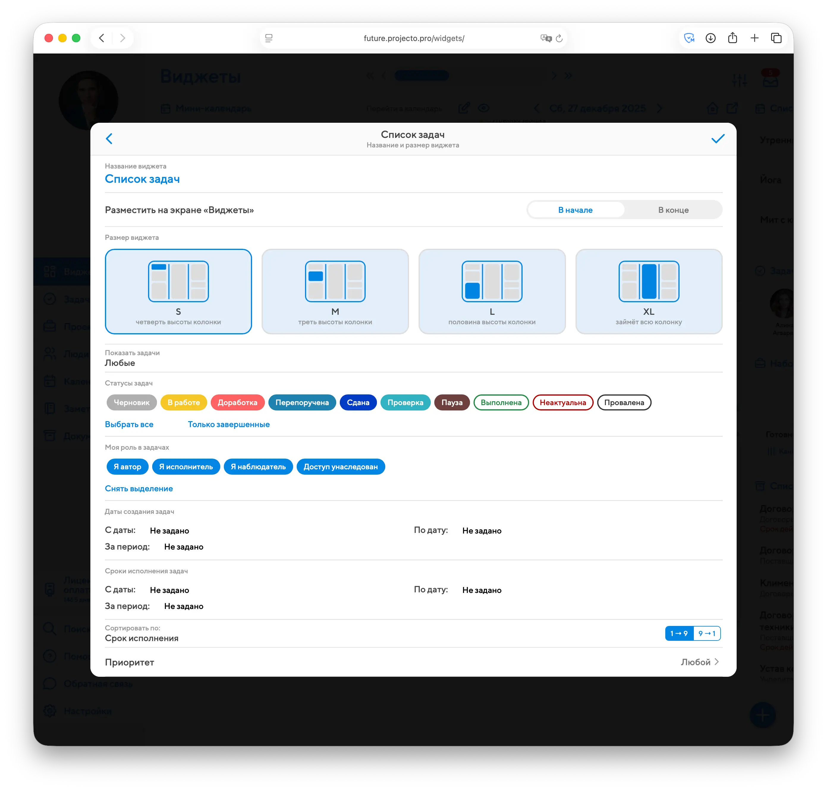 У некоторых виджетов есть дополнительные настройки фильтрации. Окно с ними очень похоже на ту фильтрацию, которая используется в остальных списках Projecto. Например, для задач вы можете настроить статусы, роли, сроки, приоритетность и многое другое: