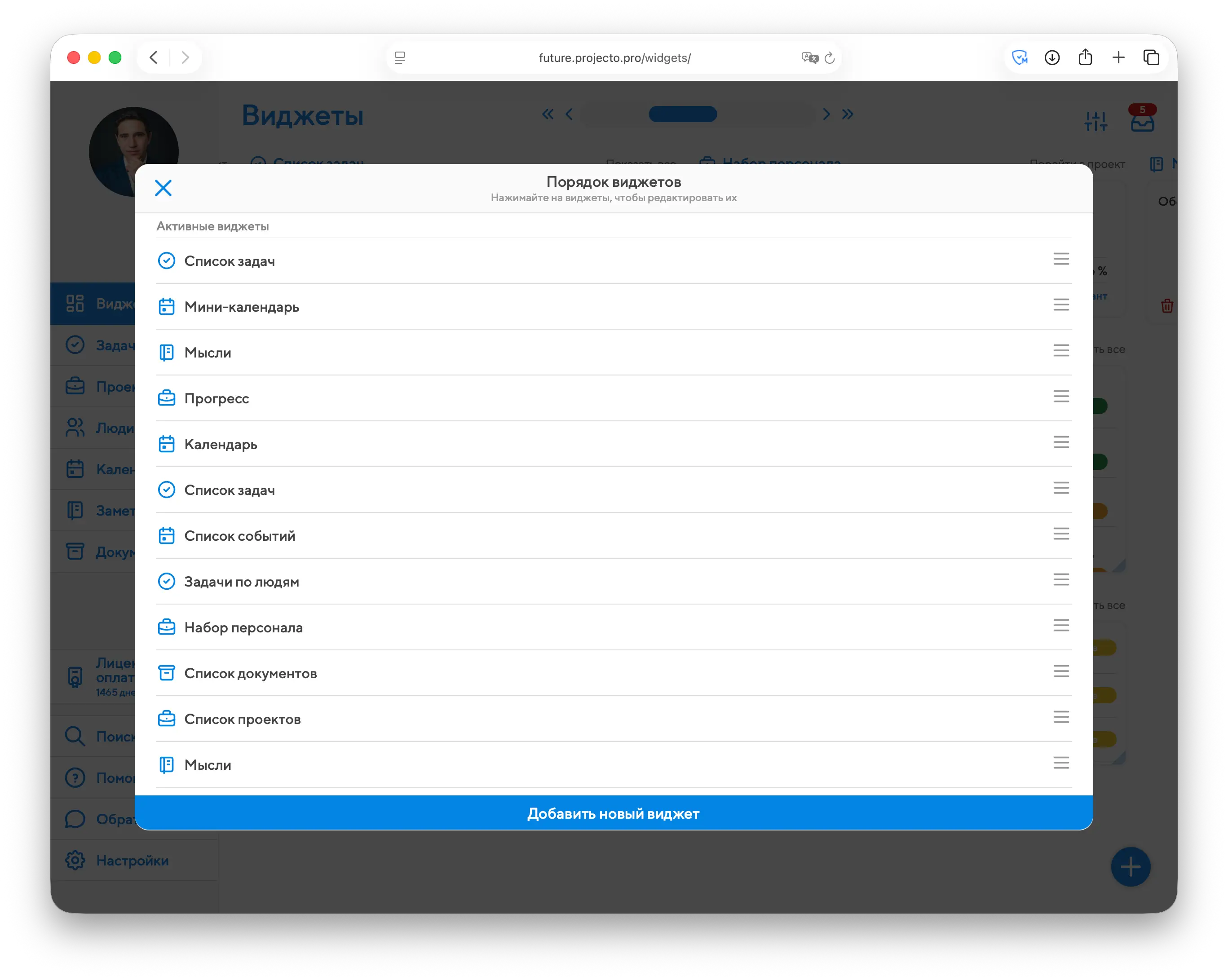 А чтобы поменять порядок виджетов, нажмите на кнопку правки в правом верхнем углу раздела Виджеты (рядом с кнопкой инбокса):