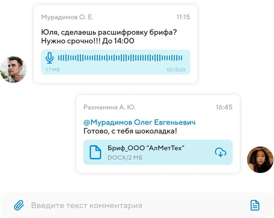 Обсуждайте детали внутри задачи, не переходя в мессенджеры и не теряя контекст. Прикрепляйте документы, изображения, файлы внутри карточек задач или в чатах. Вся история комментариев и изменений хранится автоматически, и каждый участник команды видит, кто, когда и что написал.