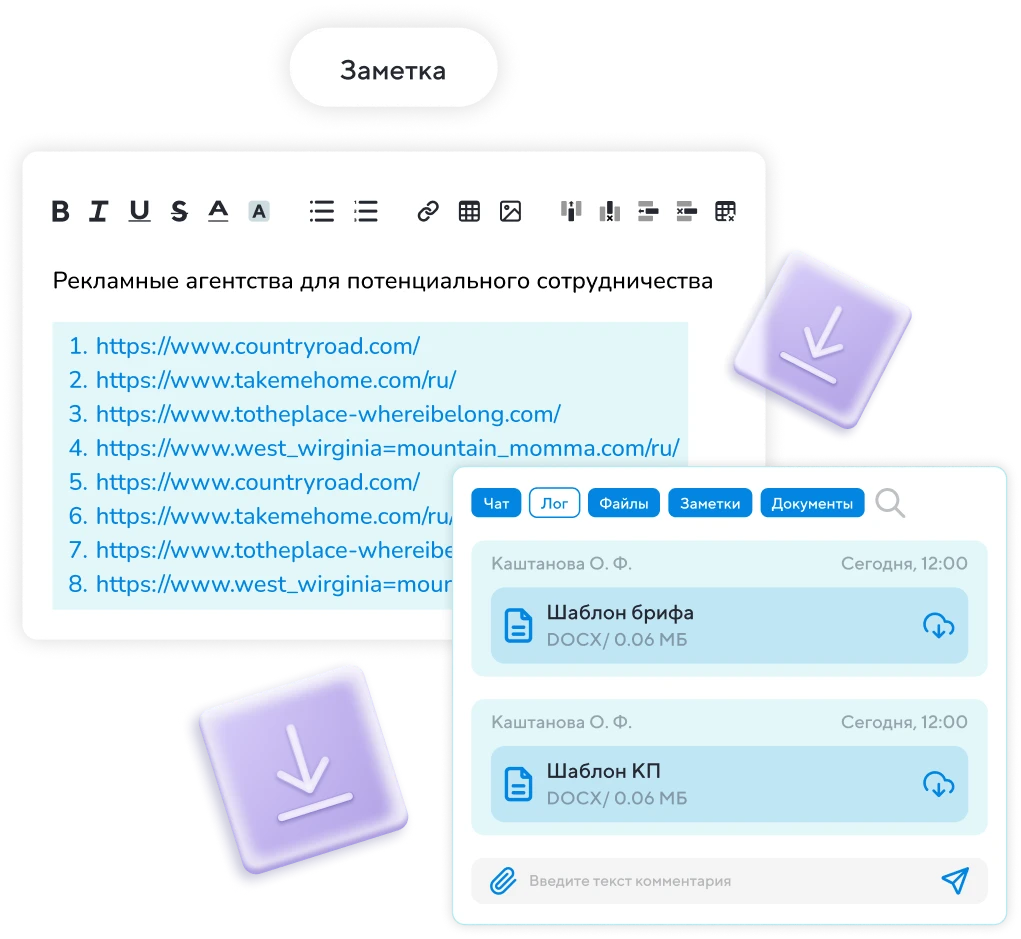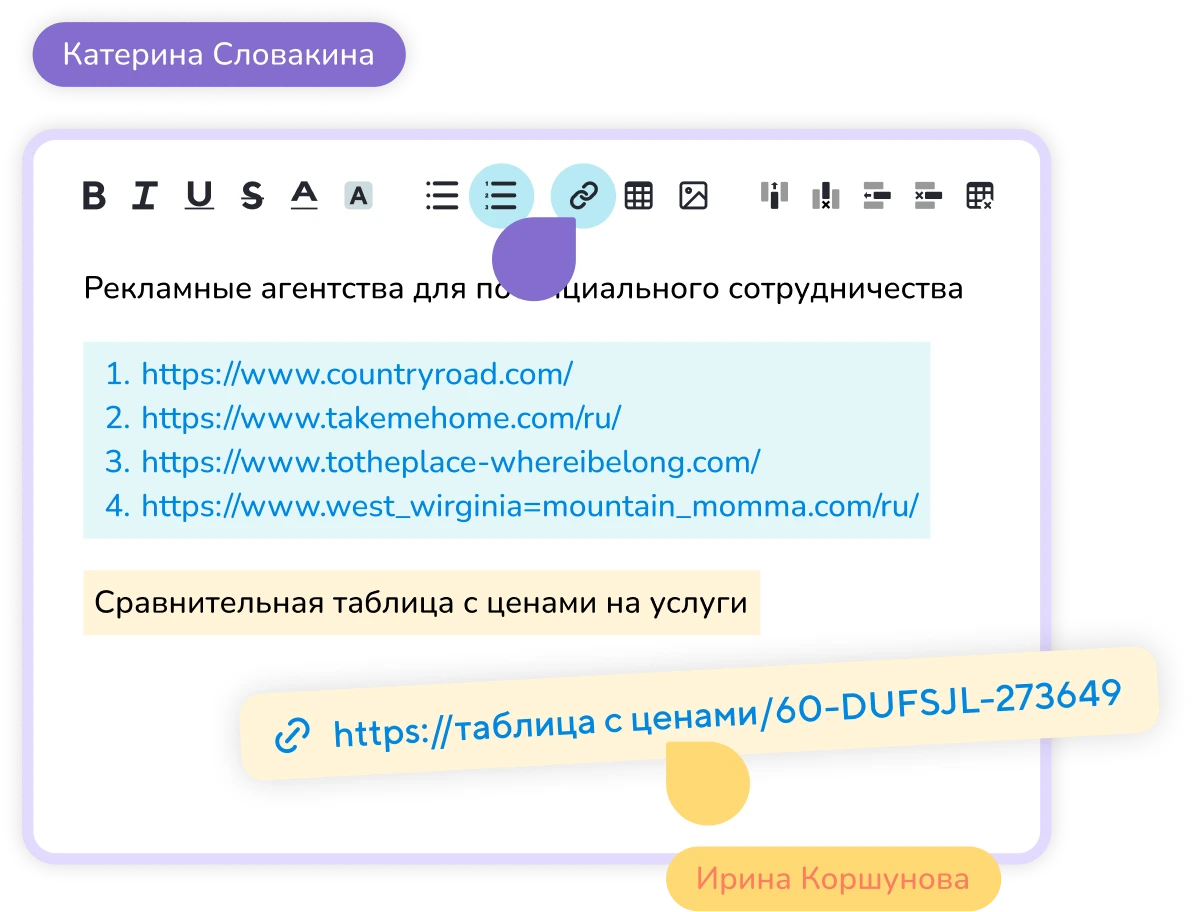 Сохраняйте важные ссылки на внутренние документы, внешние ресурсы и прочие сервисы прямо в заметках Projecto