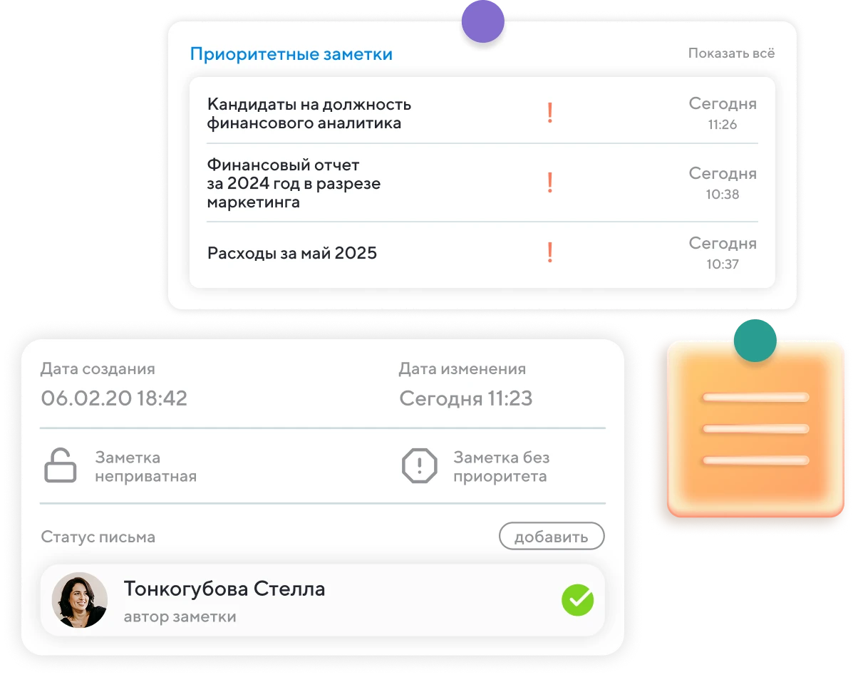 Инструкции, регламенты, ответы на частые вопросы больше не нужно просить в чате. Открываешь заметки — находишь ответ.